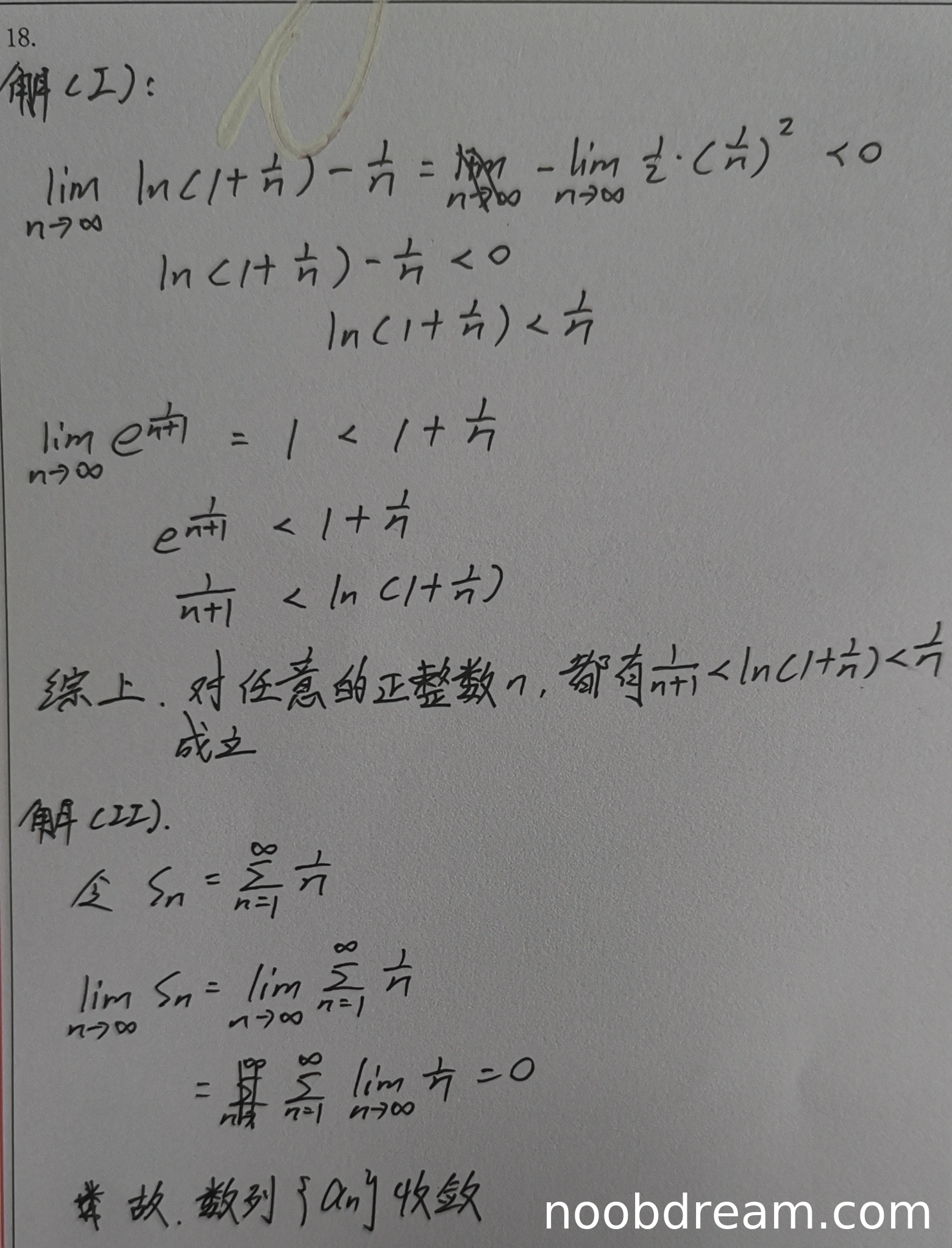 学生使用泰勒展开法证明不等式,思路正确。对于右不等式 \(\ln(1+\frac{1}{n}) < \frac{1}{n}\),通过泰勒展开得到 \(\ln(1+\frac{1}{n}) = \frac{1}{n} - \frac{1}{2n^2} + O(\frac{1}{n^3})\),直接得出不等式成立,逻辑正确。对于左不等式 \(\frac{1}{n+1} < \ln(1+\frac{1}{n})\),通过比较 \(e^{\frac{1}{n+1}} < 1+\frac{1}{n}\) 并取对数得到,方法有效。但证明过程中存在以下问题: