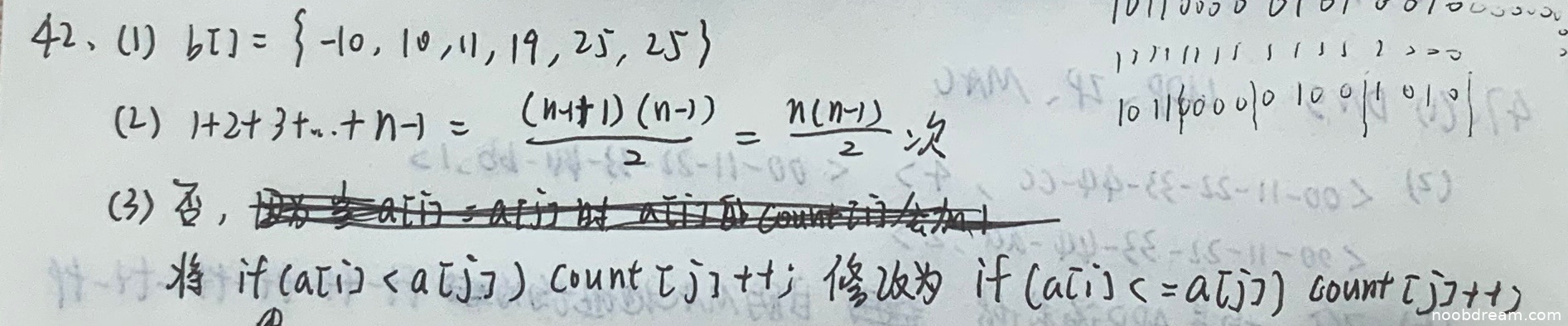 学生第二次识别结果正确给出比较次数为n(n-1)/2,推导过程清晰。得2分。