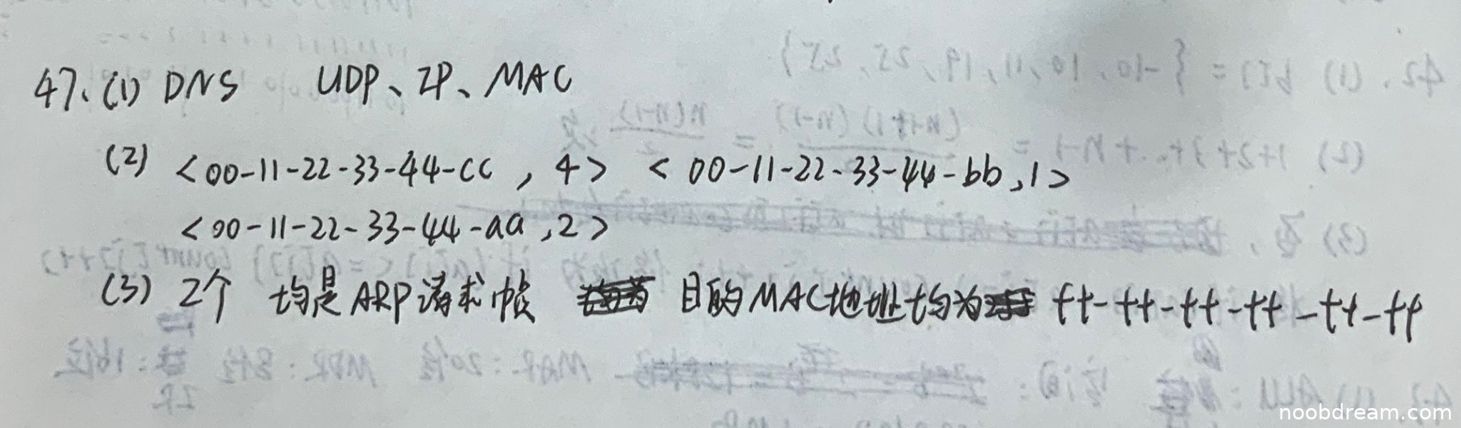 学生回答:2个、均是ARP请求帧、目的MAC地址均为ff-ff-ff-ff-ff-ff。标准答案为H2至少收到2个与Web访问相关的帧(ARP请求广播帧),目的MAC为广播地址。学生答案在数量、帧类型和目的MAC地址上均完全正确。因此得3分。
