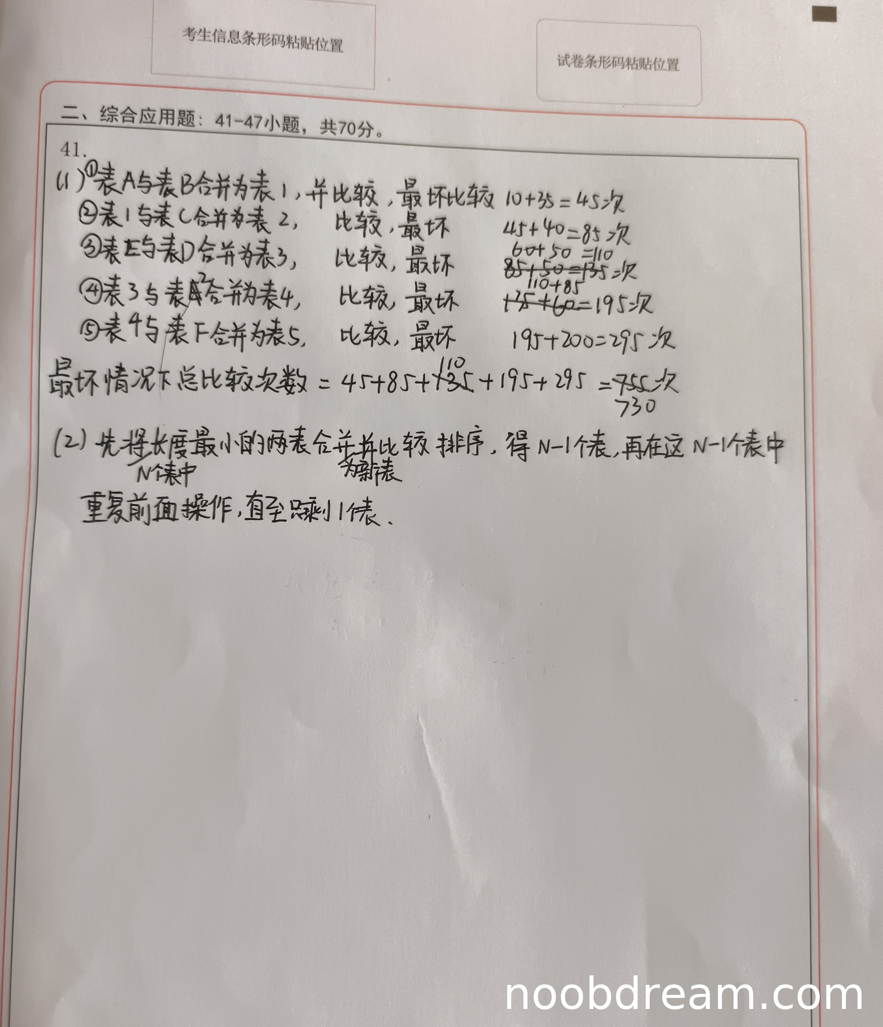 学生给出了两种合并过程,但都存在错误。第一种合并过程在步骤③和④中出现了逻辑错误(表E与表D合并后,表A已被合并,不应再次使用;且最后一步计算错误),第二种合并过程虽然步骤连续,但合并顺序未采用最优策略(哈夫曼树思想),导致总比较次数计算值(855次)高于最优值(825次)。根据标准答案评分说明,采用非最优策略但过程描述正确给3分,计算正确但结果错误给1分。此处合并过程描述基本正确但存在逻辑错误,计算过程正确但结果错误,因此扣分。得分:3分(过程描述)+1分(计算过程)=4分。