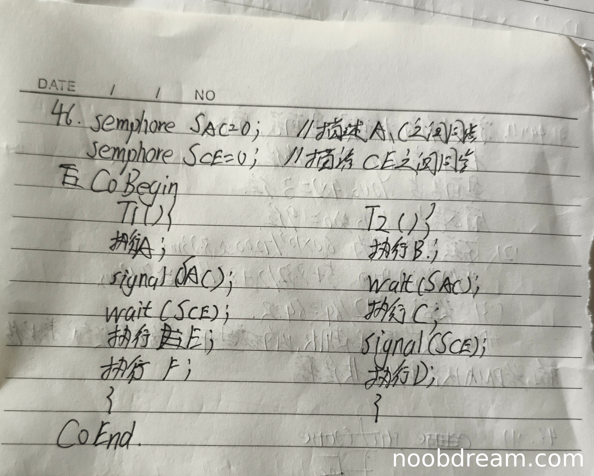 T1中:执行A后signal(SAC)正确;执行E前wait(SCE)正确;执行F不需要等待信号量直接执行正确。所有同步操作逻辑正确,得3分。