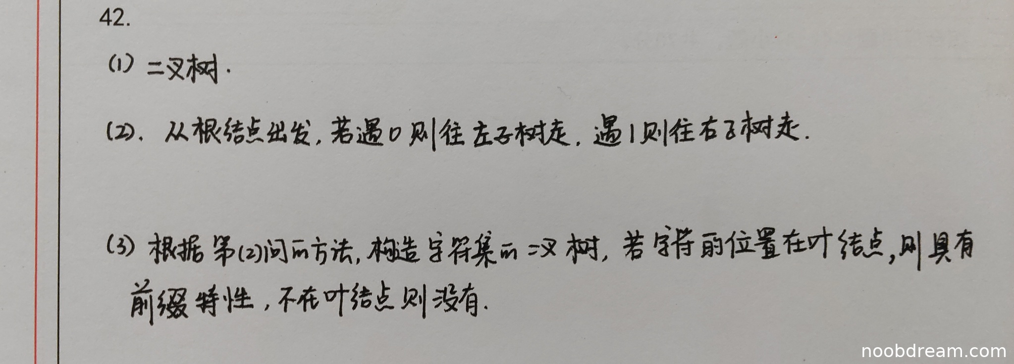 学生回答"构造字符集的二叉树,若字符的位置在叶结点,则具有前缀特性"得3分。该回答准确抓住了前缀特性的本质特征——字符编码必须对应叶结点,与标准答案的核心思想完全一致,表述清晰正确。