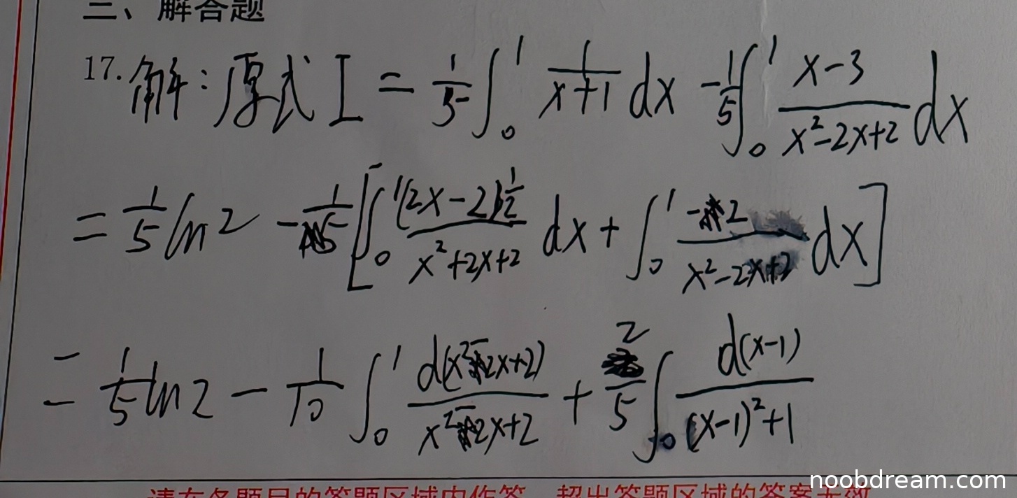 学生正确进行了部分分式分解,得到形式 \(\frac{1}{5}\int \frac{1}{x+1}dx - \frac{1}{5}\int \frac{x-3}{x^2-2x+2}dx\),这与标准答案一致。得2分。