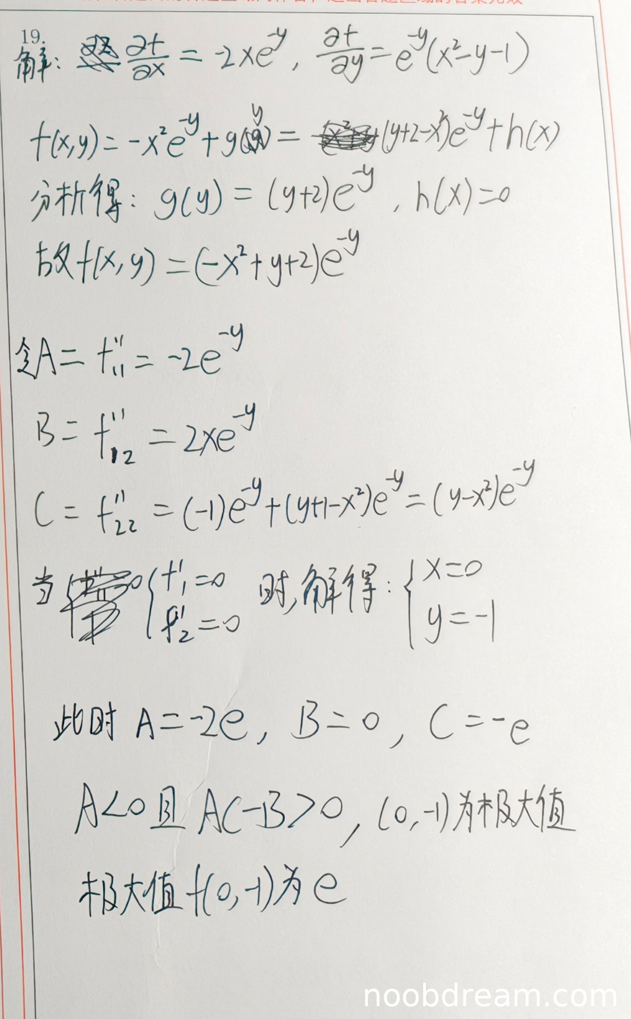 - 错误3:最终函数表达式 \( f(x,y) = (-x^2 + y + 2)e^y \) 错误(正确应为 \( f(x,y) = (-x^2 + y + 2)e^{-y} \))。