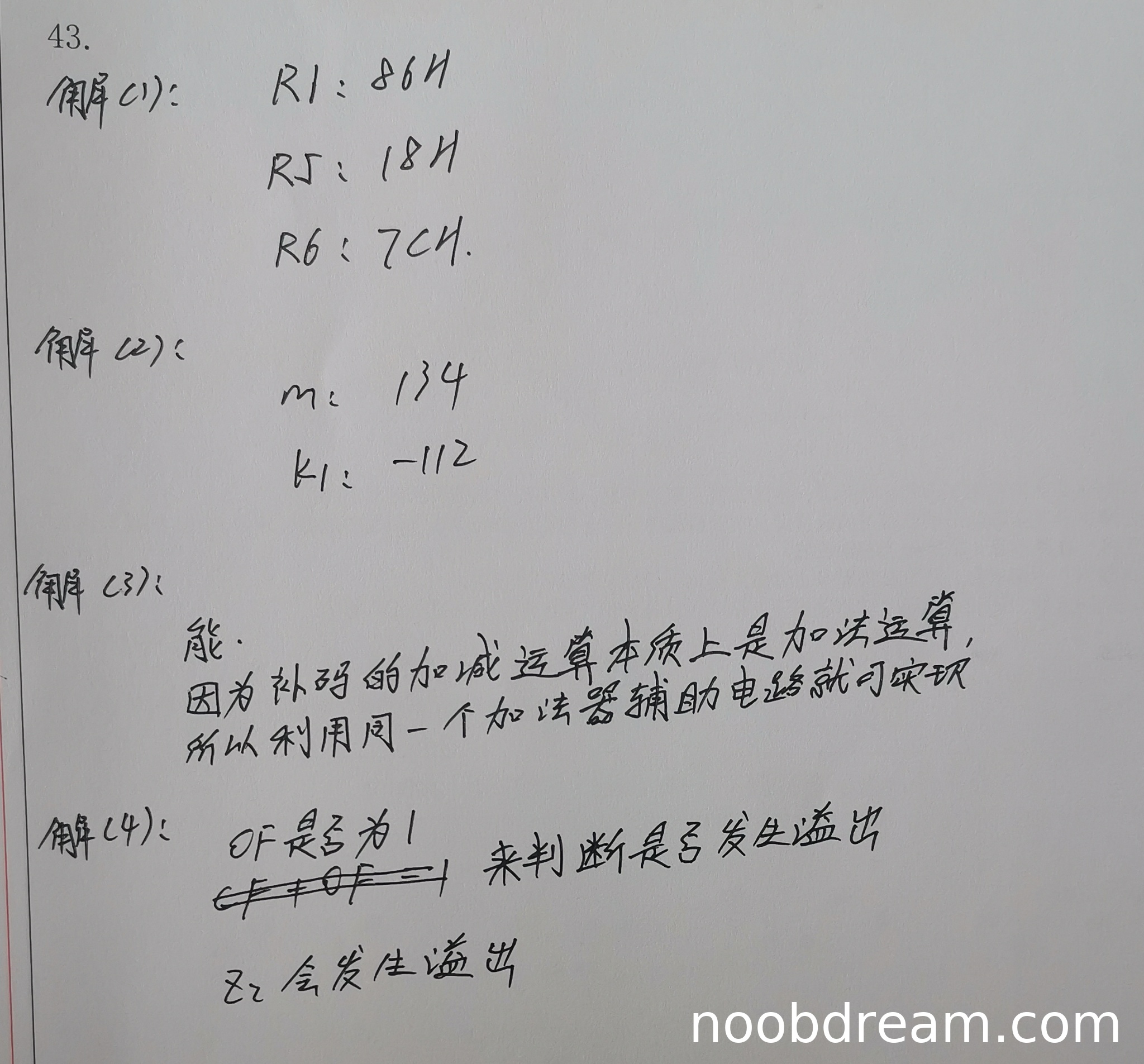 学生回答“能”正确,理由“补码的加减运算本质上是加法运算,所以利用同一个加法器辅助电路就可实现”基本正确,但未提及溢出判断电路不同等细节。根据标准答案,理由描述不够完整,但核心观点正确,因此不扣分,得2分。