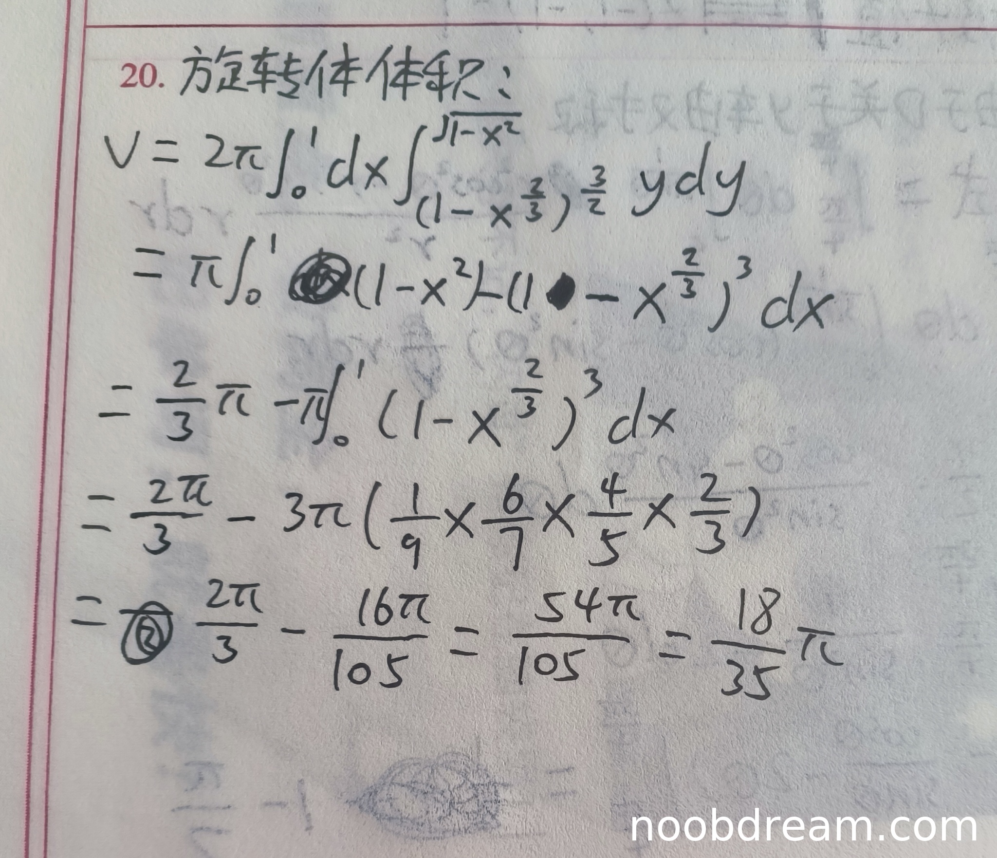 学生作答中体积计算部分思路正确,采用了二重积分方法(柱壳法)计算旋转体体积,与标准答案的圆盘法不同但结果一致。计算过程中积分表达式正确,积分上下限设置合理,最终得到正确结果 \( V = \frac{18\pi}{35} \)。虽然第一次识别结果中计算过程有误(得到 \(\frac{22\pi}{105}\)),但第二次识别中进行了修正并给出完整正确计算过程。根据评分要求,思路正确不扣分,计算错误在修正后不影响得分。因此体积部分得6分。