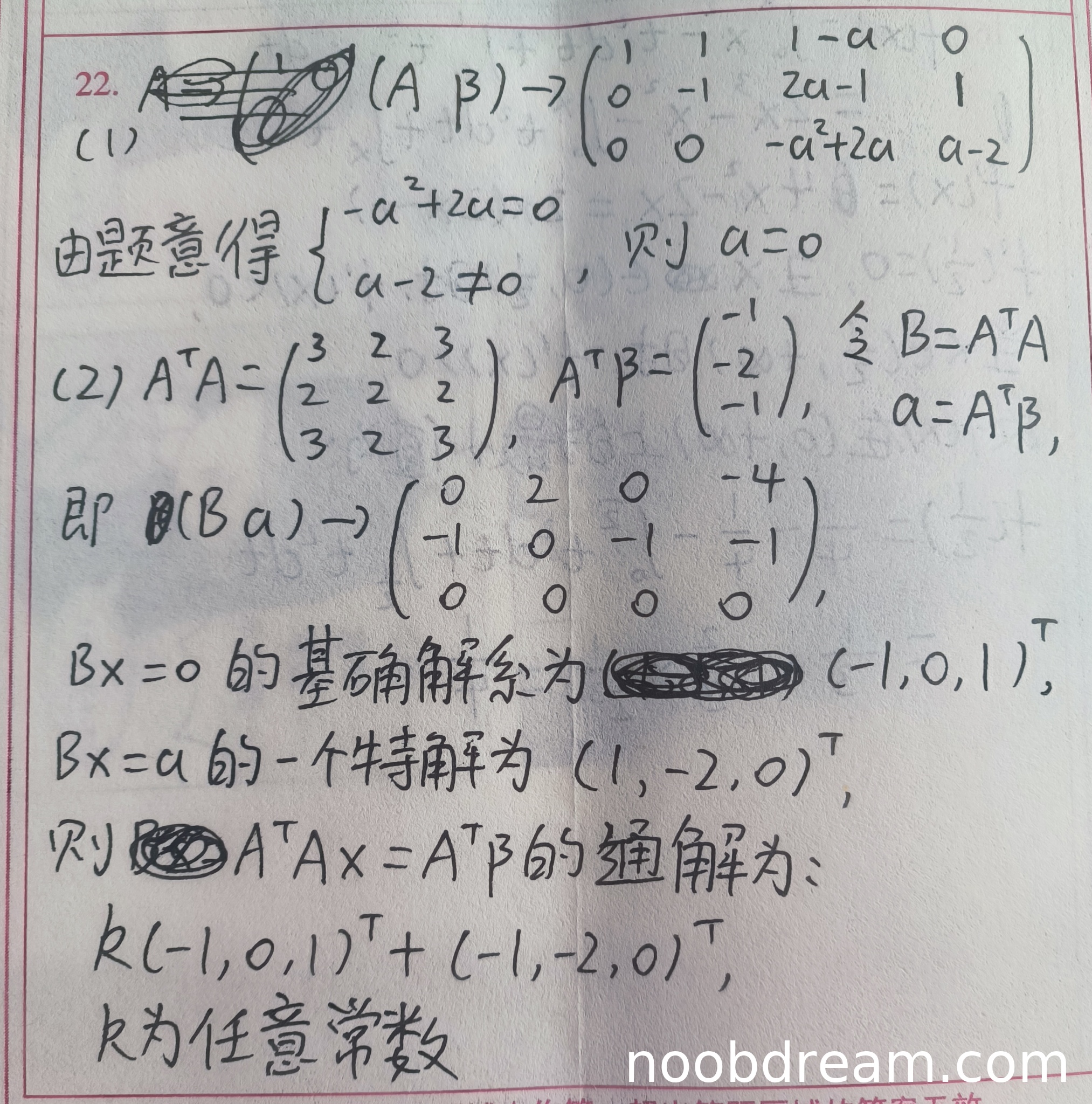 学生在计算AᵀA时出现错误:第三行第一列和第三列应为2,但学生写成了3。这导致后续计算全部基于错误矩阵进行。虽然求解方法正确,但由于基础矩阵计算错误,只能得到部分分数。考虑到学生正确理解了AᵀAx=Aᵀβ的求解思路,包括求基础解系和特解的方法,给予3分。
