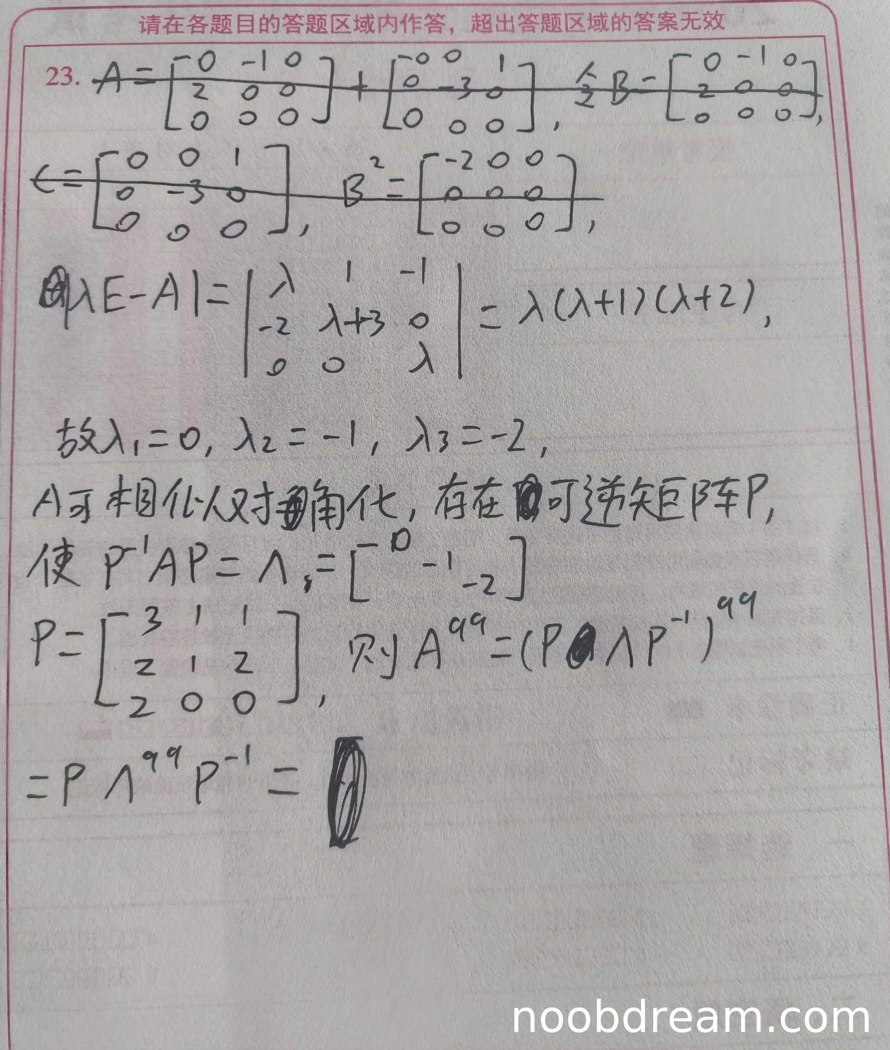学生作答中正确计算了特征多项式 |λE - A| = λ(λ+1)(λ+2),并得到特征值 λ₁=0, λ₂=-1, λ₂=-2,判断A可相似对角化,思路正确。但在构造可逆矩阵P时,给出的P矩阵与标准答案不一致(标准答案为P = [3/2,1,1; 1,1,2; 1,0,0],学生给出P = [3,1,1; 2,1,2; 2,0,0]),且未验证P是否满足P⁻¹AP=Λ。最关键的是,学生没有完成A⁹⁹的具体计算,只写出了A⁹⁹ = PΛ⁹⁹P⁻¹的形式,但Λ⁹⁹计算有误((-2)⁹⁹应等于-2⁹⁹,但学生写成了-2⁹⁹,不过这是小错误)。由于核心计算步骤缺失,扣3分。得分:2分。