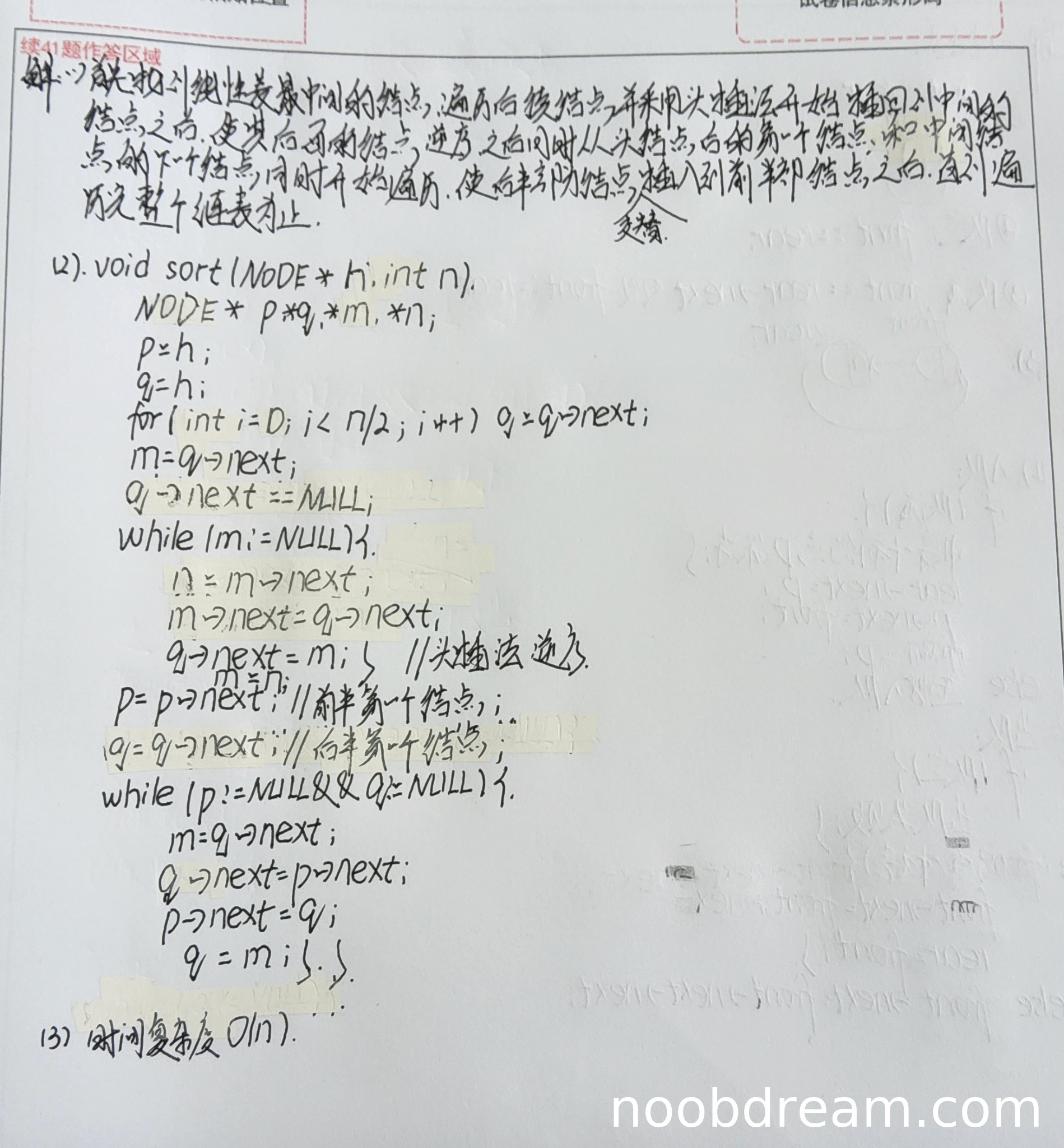学生答案的基本设计思想描述基本正确:找到中间结点、反转后半部分链表、合并前后两部分。但描述中存在一些不准确之处,如"遍历后续结点,并利用头插法开始插入到中间的结点之后"表述不够清晰,且未明确说明合并时的交替插入方式。整体思路与标准答案一致,扣1分。