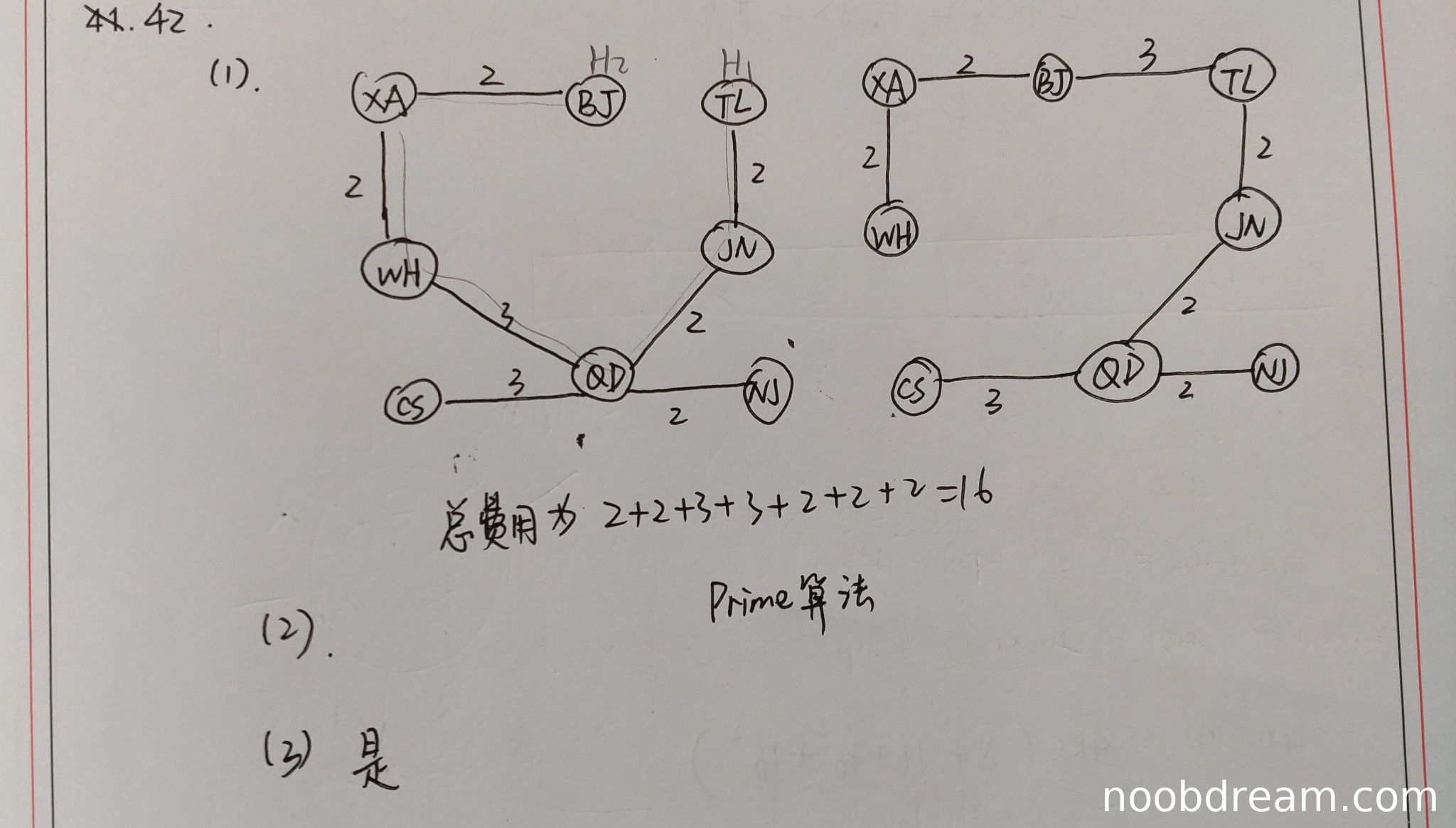 学生给出了总费用16,这与标准答案一致,说明计算正确。但学生没有给出具体的最小生成树方案(边列表或图示),只提到了使用Prime算法(应为Prim算法)。由于题目要求"给出所有可能的最经济的光缆铺设方案(用带权图表示)",学生没有展示具体方案,因此扣2分。费用计算正确得2分。