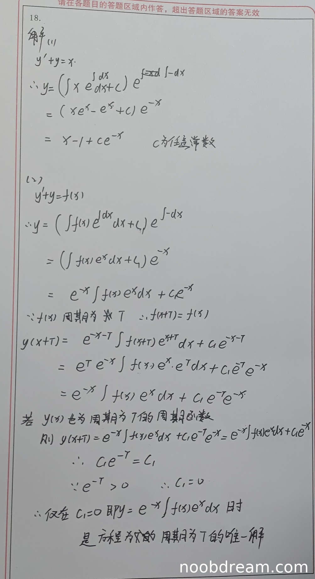 学生正确写出通解形式 \(y = e^{-x}(\int f(x)e^x dx + C_1)\),并利用周期条件 \(f(x+T)=f(x)\) 计算 \(y(x+T)\)。但在推导周期解时存在逻辑错误: