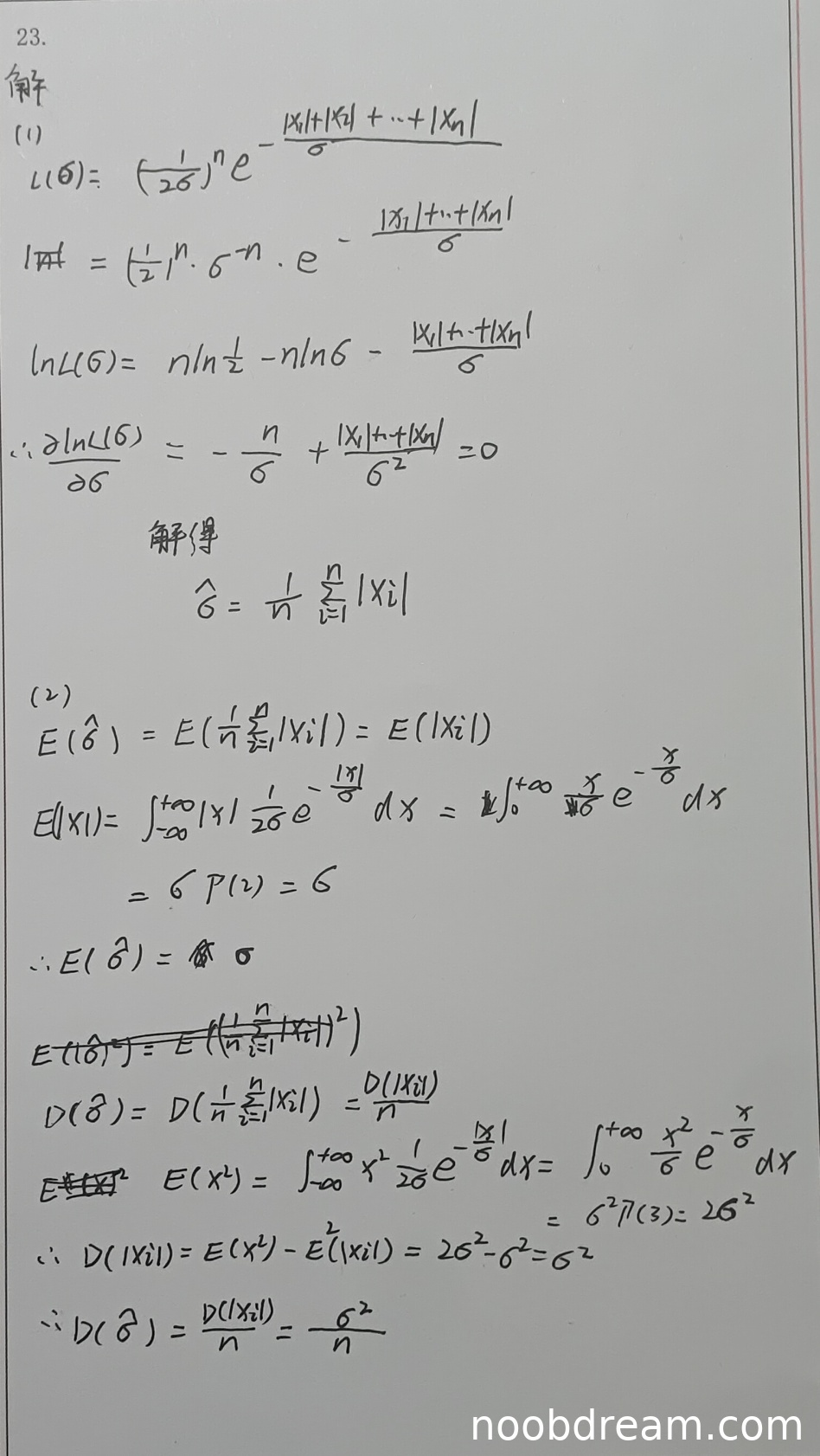 - 计算 \(D(\hat{\sigma})\) 时,思路正确,但积分计算中出现“\(=6^{2}\varGamma(3)=2\sigma^{2}\)”,其中“6”应为“\(\sigma\)”的误写(标准答案为 \(\sigma^2 \Gamma(3)=2\sigma^2\)),但最终结果 \(D(\hat{\sigma})=\frac{\sigma^2}{n}\) 正确。判定为误写,不扣分。