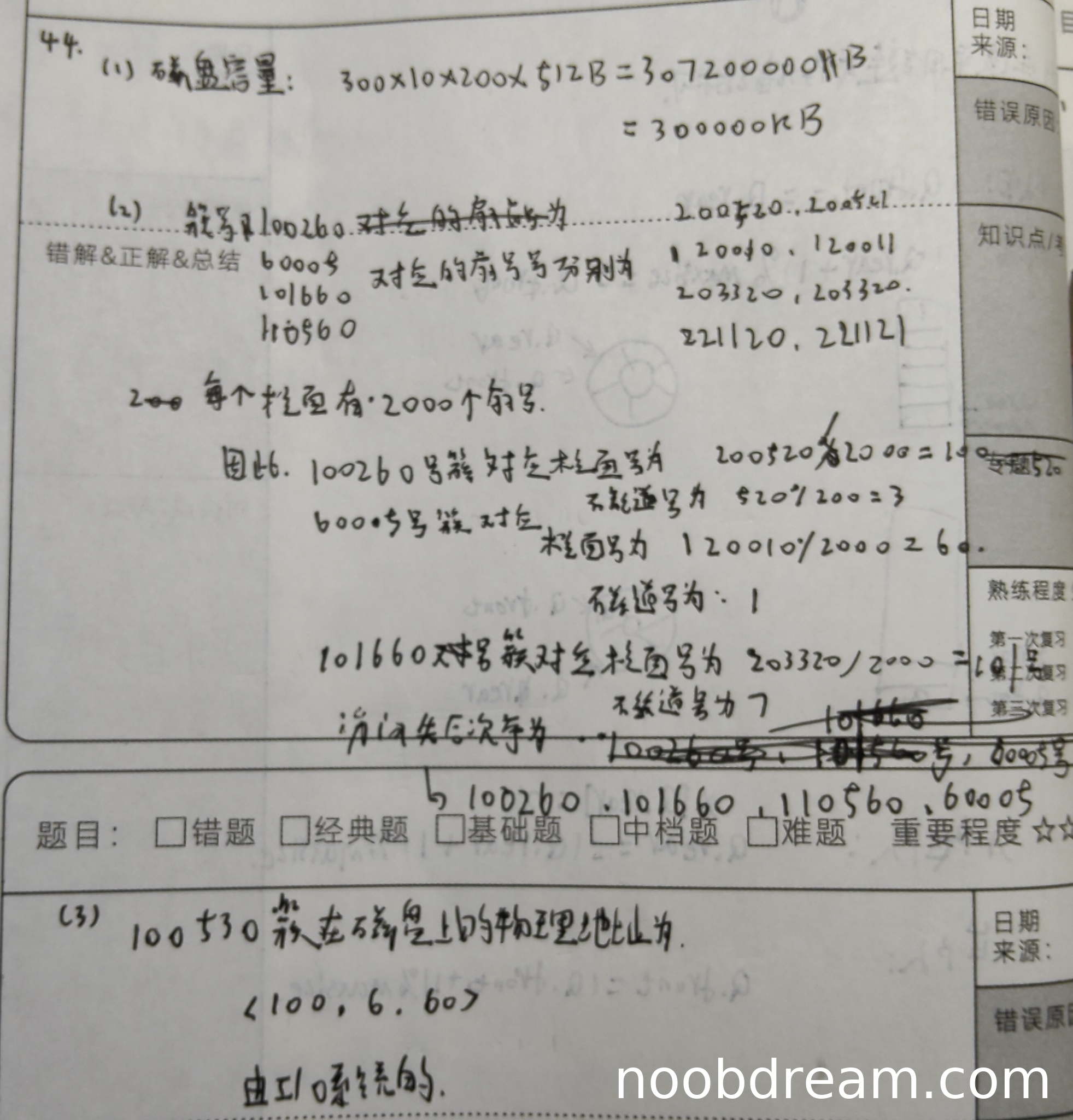 学生计算了磁盘容量:300×10×200×512B = 307200000B = 300000KB。标准答案为300×10×200×512B = 3×10^5KB,即300000KB。学生答案与标准答案一致,计算正确。得2分。