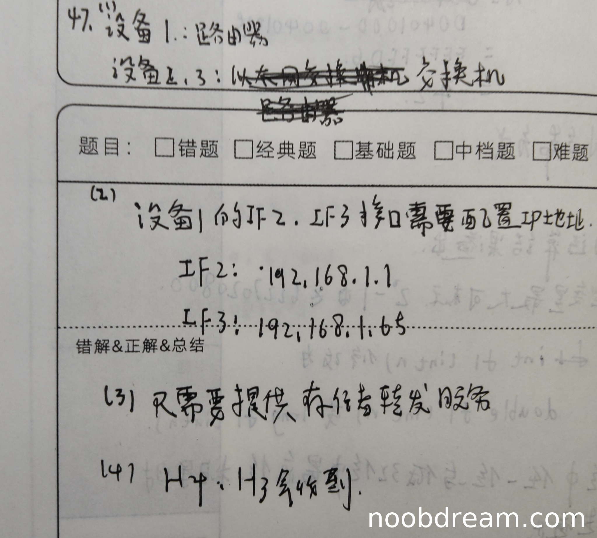 学生回答存在以下问题: - 仅指出设备1的IF2和IF3接口需要配置IP地址,遗漏了IF1接口(192.168.1.254) - 虽然正确配置了IF2和IF3的IP地址,但未完整回答所有需要配置的接口 根据标准答案要求,设备1的三个接口都需要配置IP地址,学生回答不完整。 扣分:遗漏IF1接口扣2分,正确配置已提及的两个接口得2分,本小题得2分。