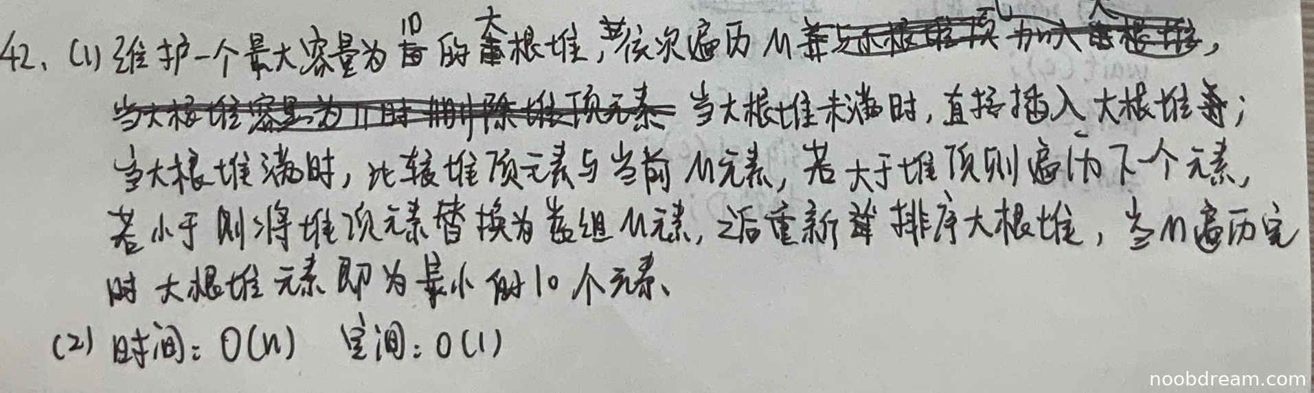 学生正确给出了时间复杂度为O(n)和空间复杂度为O(1)。时间复杂度分析合理:构建初始堆为O(1),遍历n个元素每次堆调整O(log k)(k=10),总体O(n log k) ≈ O(n);空间复杂度为原地操作,O(1)。与标准答案一致。因此得5分。