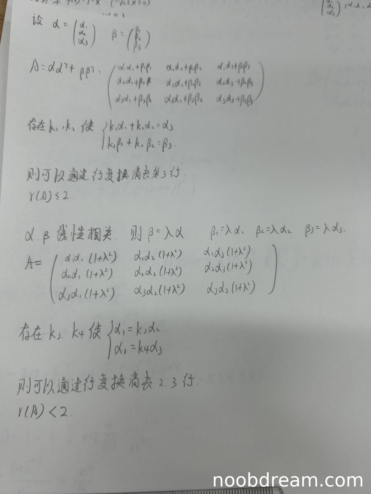 学生答案:当α,β线性相关时,设β=λα,正确写出了A=(1+λ²)ααᵀ。但在后续论证中,学生假设存在k₃,k₄使得α₁=k₃α₂且α₁=k₄α₃,这个假设不合理且论证混乱。实际上,当α,β线性相关时,A的秩最多为1,因为A是ααᵀ的倍数。学生虽然得出了正确结论r(A)<2,但论证过程存在严重逻辑问题。