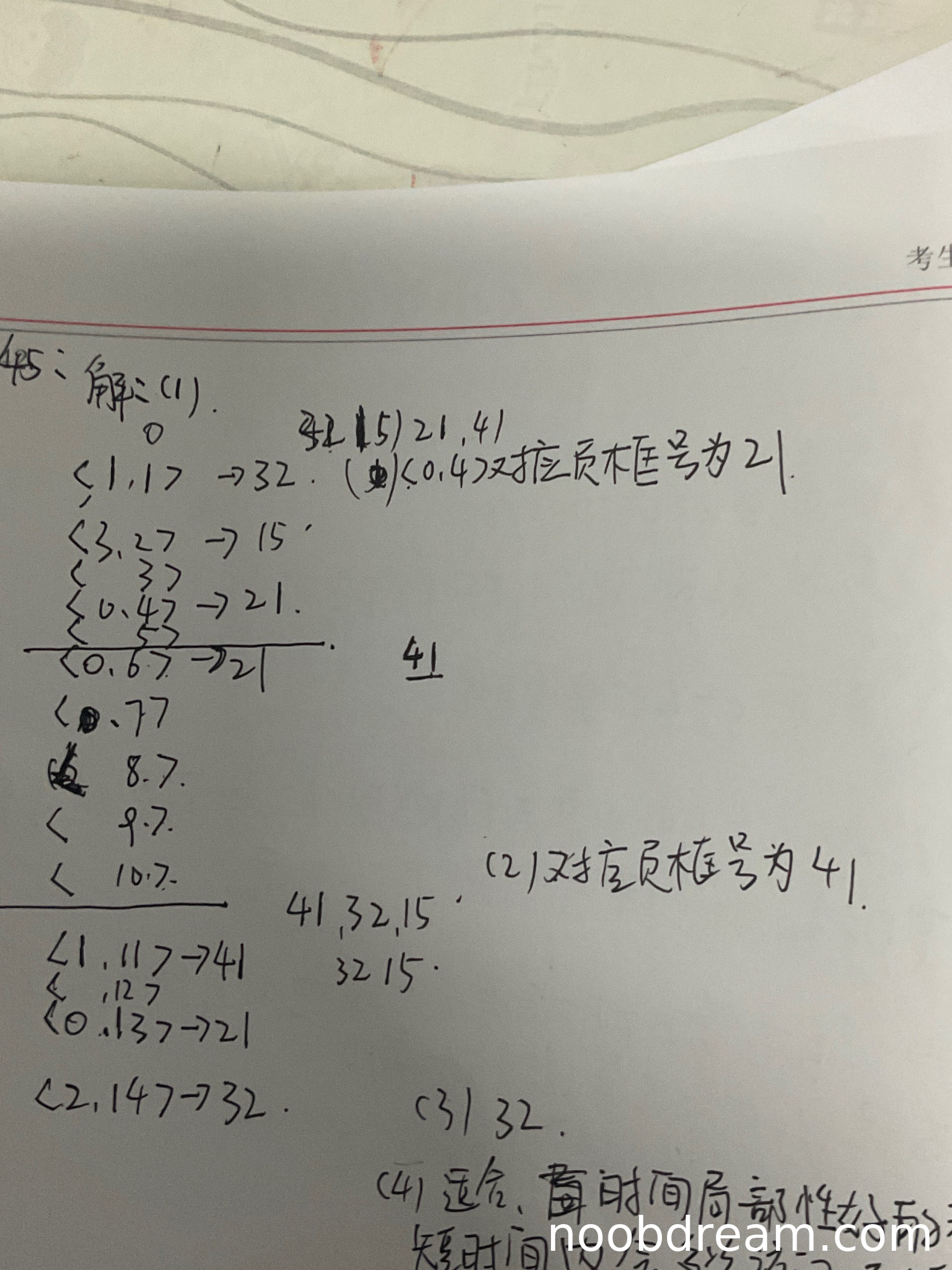 学生两次识别结果都给出了页框号41,但标准答案是32。学生没有说明理由,且答案错误。根据标准答案,访问<1,11>时,页1曾在时刻1被访问过,在第二轮扫描(时刻10)时因未被访问而被回收,但页框内容未被清空,在时刻11访问时因页仍在空闲链表中,故应重新放回驻留集,且应使用原页框32。学生答案错误且无理由,扣2分。得0分。