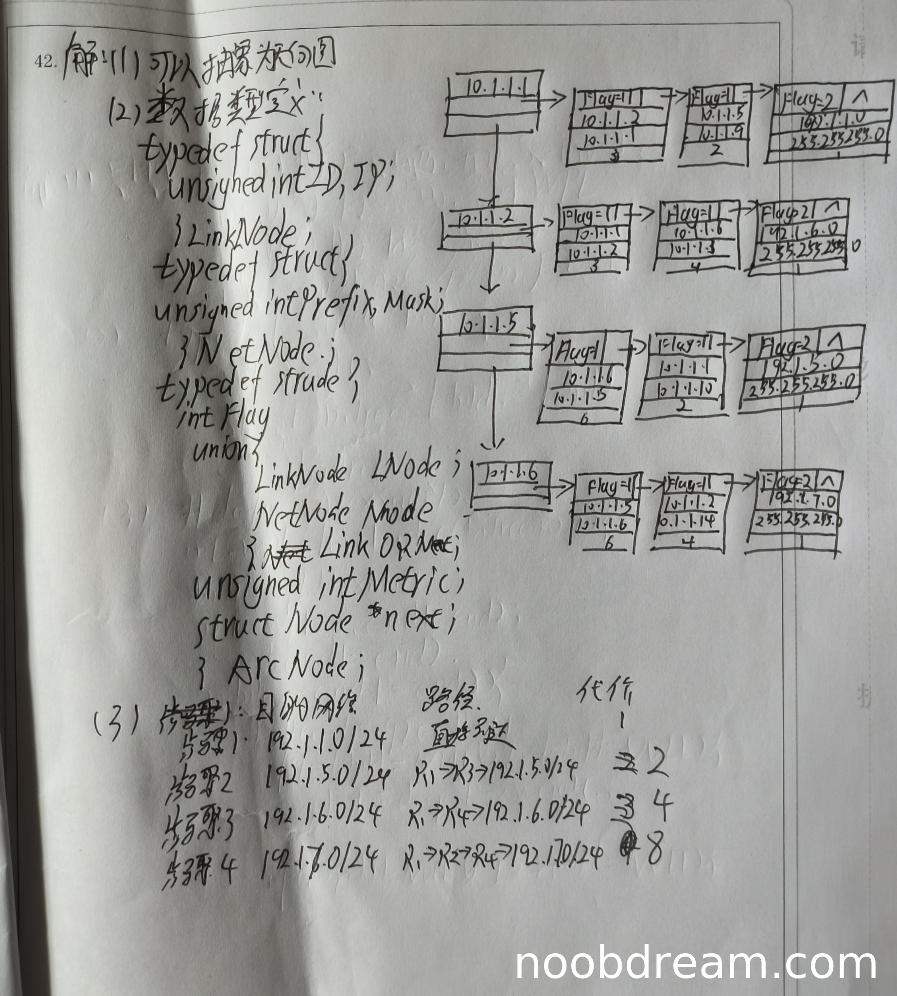 学生给出了链式存储结构的数据定义,包括LinkNode、NetNode和ArcNode结构体,并使用了union来区分Link和Net类型,这与标准答案的思路一致。但学生的定义中缺少表头结点(HNode)的定义,且ArcNode中的next指针类型定义有误(应为struct ArcNode *next)。此外,学生未画出链式存储结构示意图。根据评分说明,数据类型定义部分可得3分,示意图部分缺失扣2分。因此,得3分。