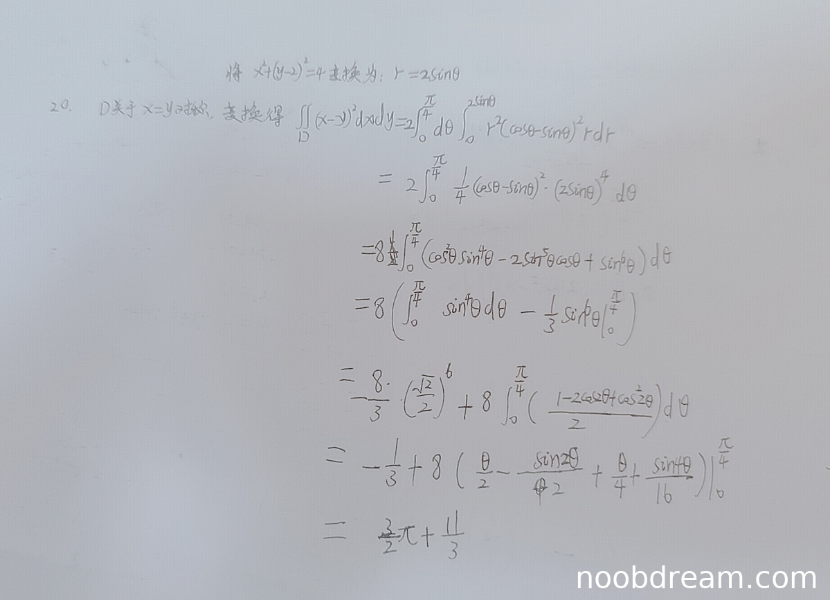 - 在极坐标积分表达式中,学生写为 \(\int_0^{\pi/4}d\theta\int_0^{2\sin\theta} r^2(\cos\theta-\sin\theta)^2 r dr\),这里上限 \(2\sin\theta\) 是错误的,应为 \(4\sin\theta\)。但根据上下文,后续计算中实际使用了 \((2\sin\theta)^4\),即 \(16\sin^4\theta\),这与 \(r=4\sin\theta\) 时 \(r^4=256\sin^4\theta\) 不符,表明学生实际采用了 \(r=2\sin\theta\) 的错误假设。这是一个逻辑错误,导致后续计算全部错误。