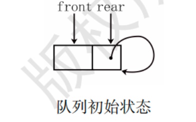 (4)入队操作:首先判断队列是否为满(front==rear->next),若为满,则队列以无空节点,需要新建一个节点,插到队尾rear后,假设新元素为e,则rear->data=e;rear=rear->next;