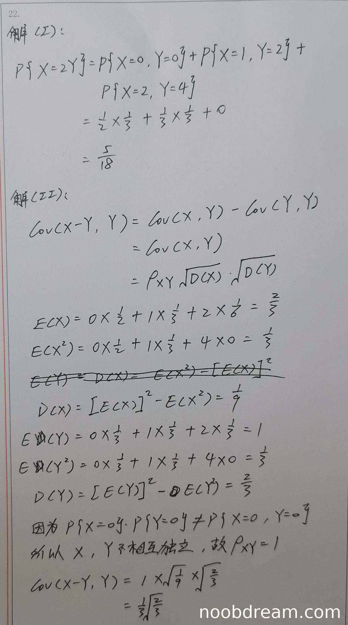 - 性质应用:正确写出 Cov(X-Y,Y) = Cov(X,Y) - Cov(Y,Y),但后续错误地认为 Cov(X,Y) = ρXY√D(X)√D(Y),而标准方法应通过 EXY - EX·EY 计算。