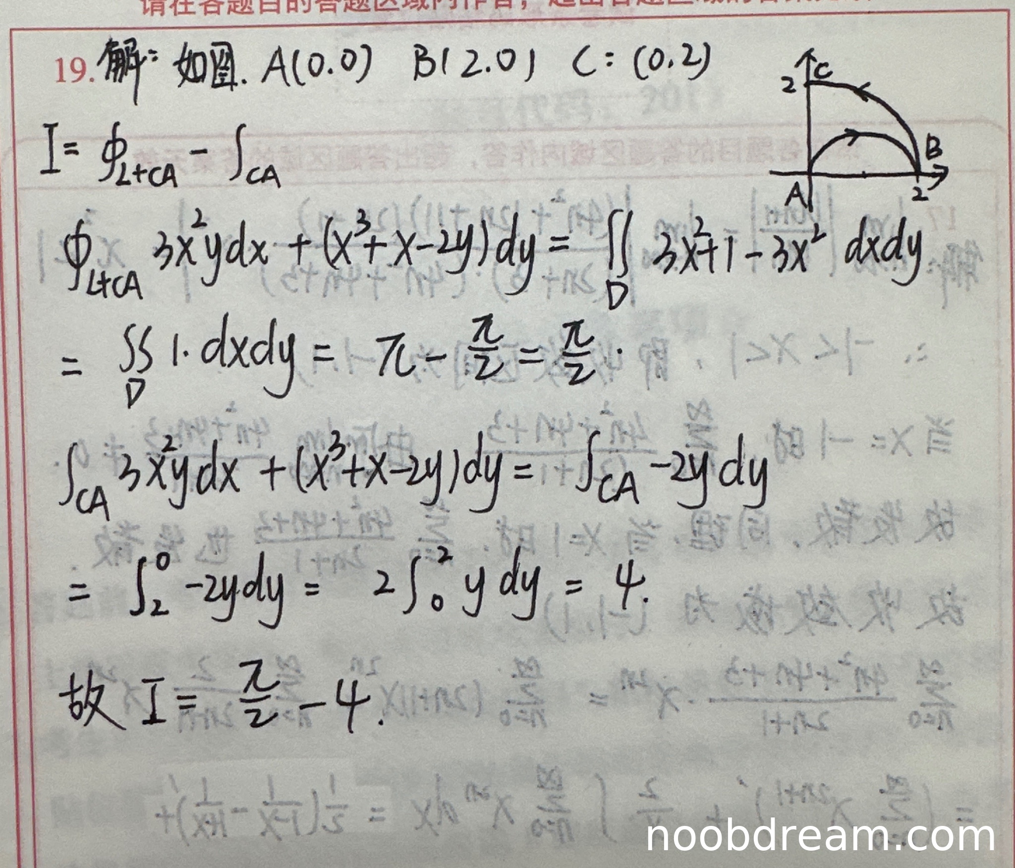 - 正确补线(从(0,2)到(0,0)的直线段,记为CA),构成逆时针或顺时针封闭曲线(学生未明确方向,但计算中处理正确)。