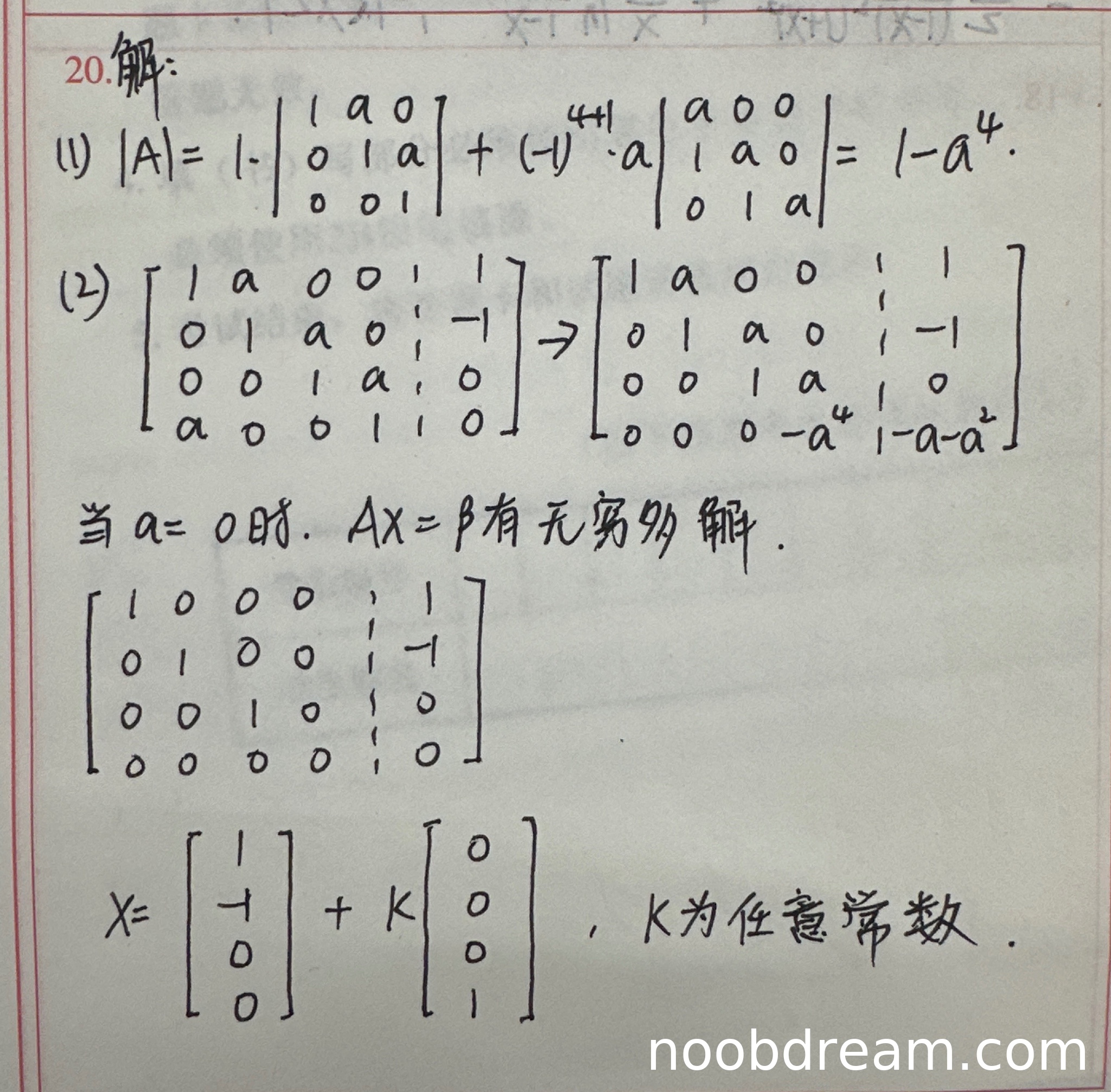 虽然学生知道无穷多解需要满足系数矩阵与增广矩阵秩相等且小于未知数个数,但具体计算和判断完全错误。考虑到这部分思路基本正确但计算严重错误,给予1分。