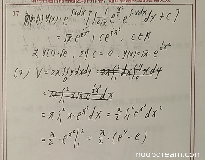 而实际上应该是 \(\pi\int_{1}^{2}(\sqrt{x}e^{\frac{x^2}{2}})^2 dx = \pi\int_{1}^{2}xe^{x^2}dx\)