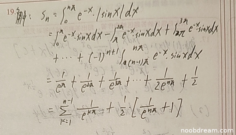 学生正确理解了面积公式为 \(S_n = \int_0^{n\pi} e^{-x} |\sin x| \, dx\),并正确将积分区间按正弦函数的正负性分段处理。在计算每个子区间上的积分时,使用了正确的分部积分法,得到了 \(\int e^{-x} \sin x \, dx = -\frac{1}{2} e^{-x} (\sin x + \cos x) + C\),并正确计算了定积分值。最终将面积表示为等比数列求和的形式,并正确求和得到 \(S_n = \frac{1 - e^{-(n-1)\pi}}{e^{\pi} - 1} + \frac{1}{2} \left( \frac{1}{e^{n\pi}} + 1 \right)\),这与标准答案等价(标准答案为 \(S_n = \frac{1}{2} + \frac{e^{-\pi}[1 - e^{-(n-1)\pi}]}{1 - e^{-\pi}} + \frac{1}{2} e^{-n\pi}\),经代数变换可相互转化)。因此,该部分思路正确、计算无误,得10分。