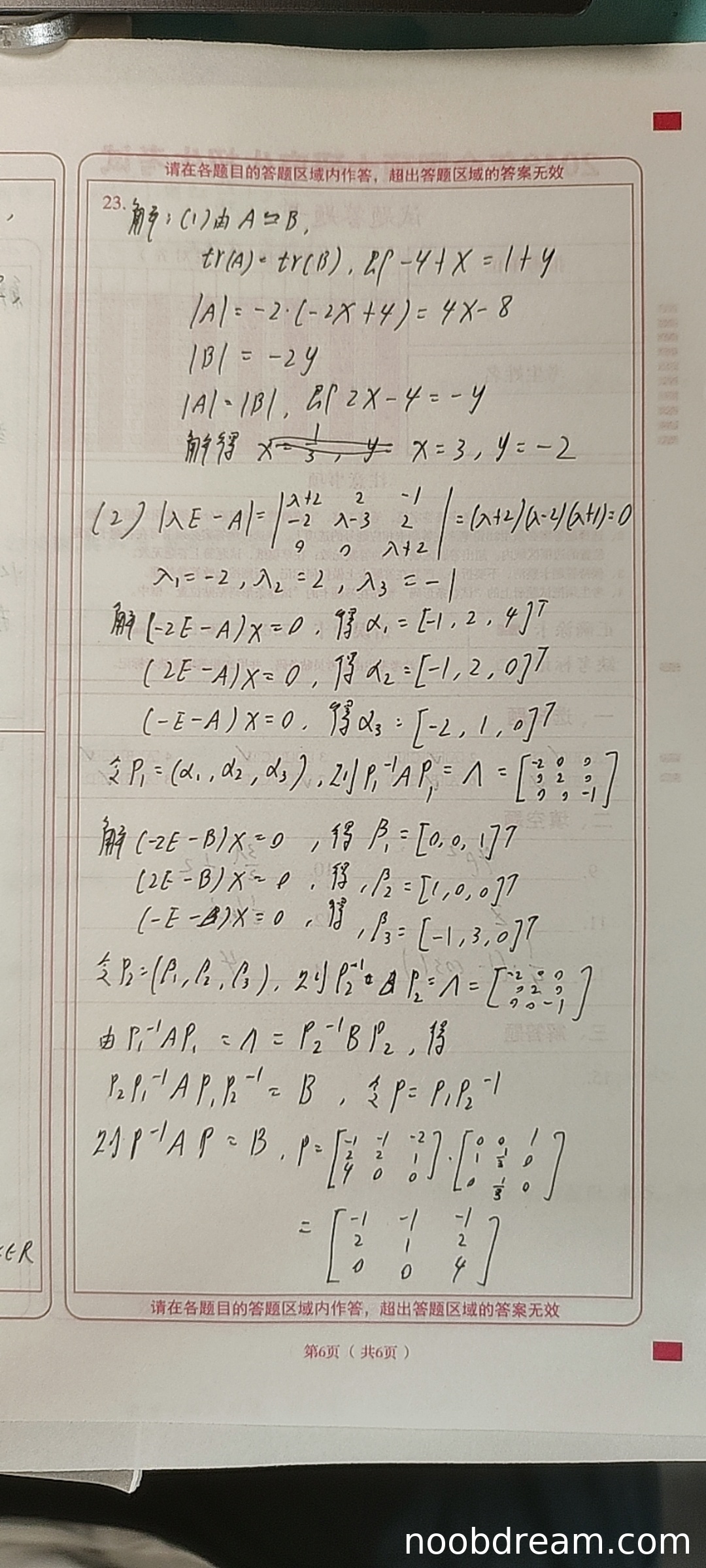 学生采用了正确的思路:分别求A和B的特征值和特征向量,通过相似对角化找到过渡矩阵P。但在具体计算中存在多处错误: