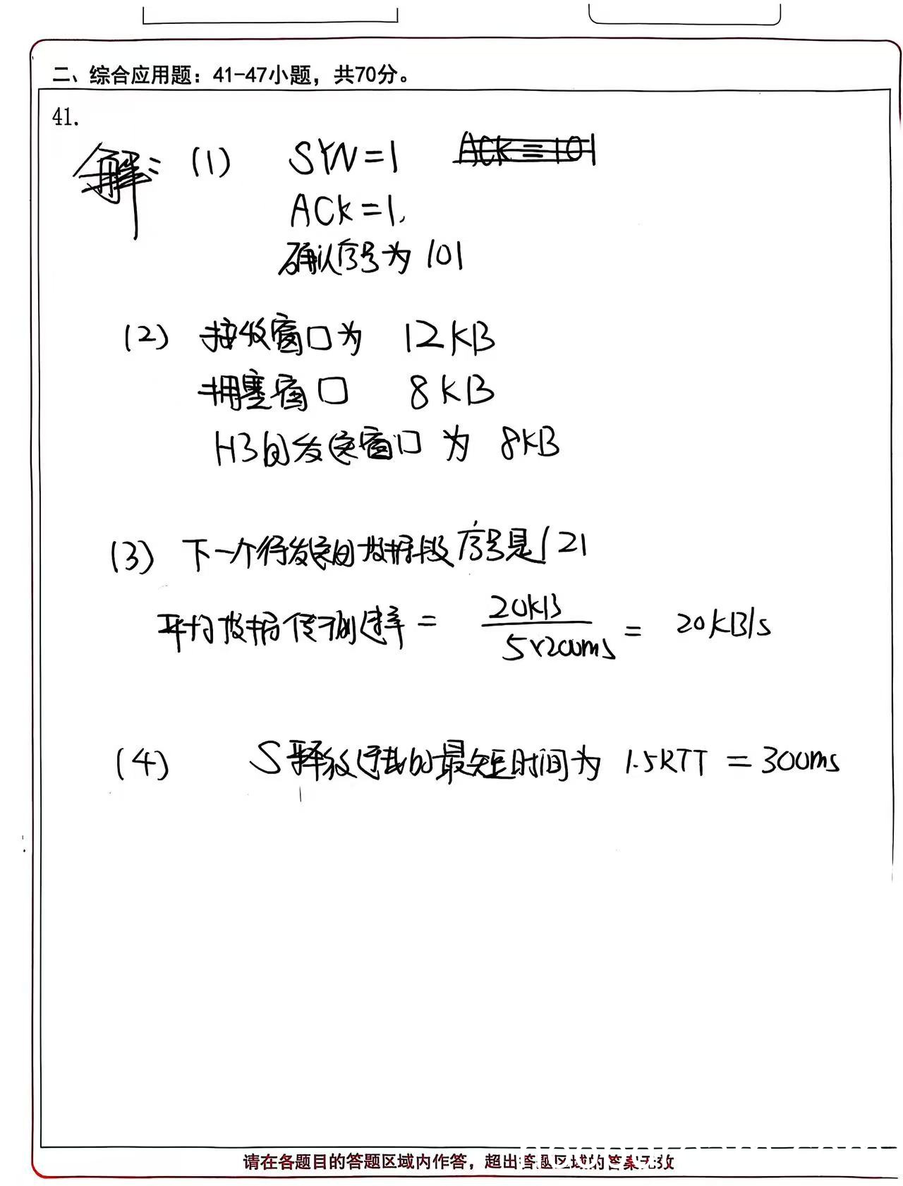 理由:发送窗口为0时已发送数据量等于接收缓存20KB,初始序号100,下一个待发送序号应为100+20×1024+1=20581。平均速率应为20×1024×8/(10×0.2)=81920bps=20.48kbps。