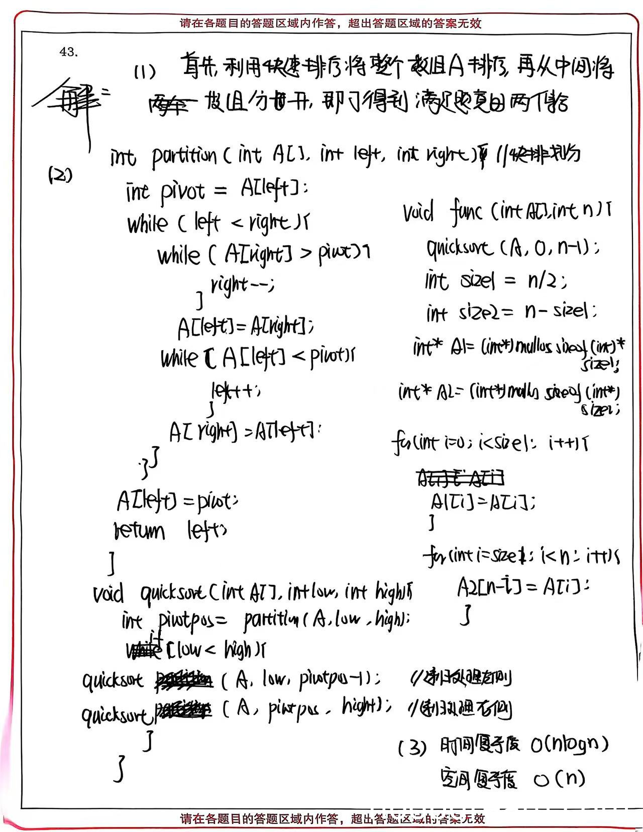 理由:学生正确分析了算法的时间复杂度O(nlogn)和空间复杂度O(n),这与他们实现的完整快速排序算法相符。