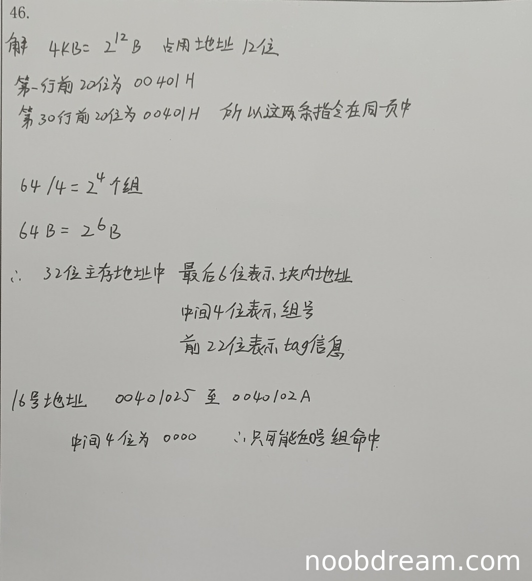 第一问:学生正确指出页大小为4KB=2^12B,占用地址12位,并正确提取了第1行和第30行指令地址的高20位(虚页号)均为00401H,从而得出两条指令在同一页中的结论,与标准答案一致。得2分(第一问分值按题目总分7分分配,第一问约占2分)。