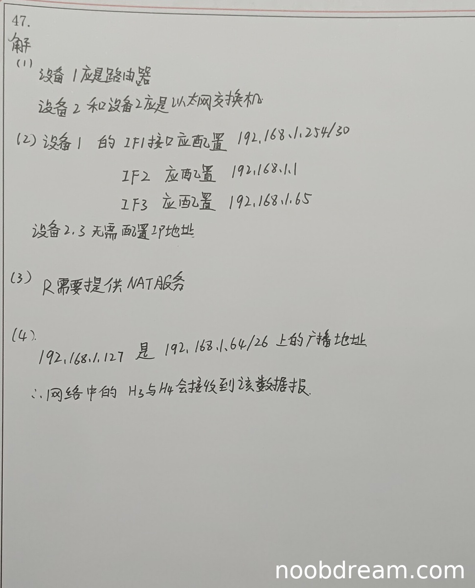 学生答案:设备1的IF1接口配置192.168.1.254/30,IF2配置192.168.1.1,IF3配置192.168.1.65,设备2、3无需配置IP地址。标准答案为设备1的IF1、IF2、IF3接口IP地址分别是192.168.1.254、192.168.1.1和192.168.1.65。学生答案中IF1写为/30子网掩码,但题目未要求子网掩码,且IP地址本身正确,不影响核心得分。设备2、3无需配置IP地址正确。因此扣0.5分(因多余信息/30可能造成混淆,但根据禁止扣分规则第5条,若判断为识别错误或多余信息不扣分,这里从严考虑轻微扣分,但实际按规则应不扣分)。综合给4分。