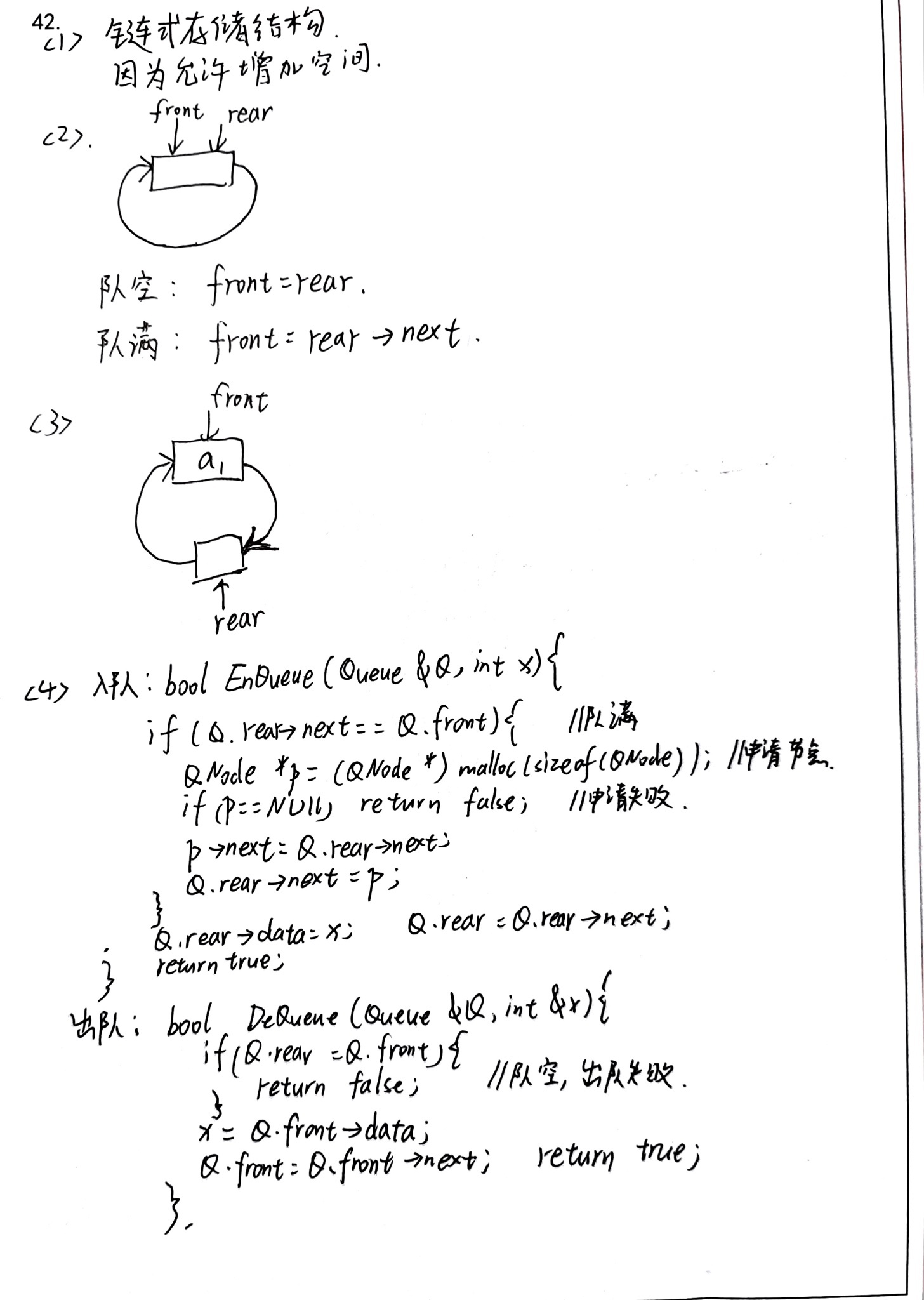 学生的入队和出队操作基本正确,时间复杂度为O(1)。但在入队操作中,当队满时申请新节点后,没有将新节点链接成循环结构(缺少p->next = Q.front),这是一个逻辑错误,扣1分。得1分。