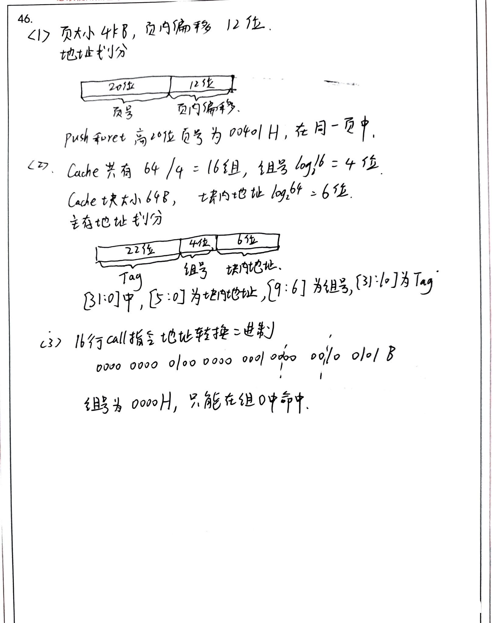 学生正确指出页大小为4KB,页内偏移12位,页号占高20位,并正确计算了push和ret指令的页号均为00401H,因此判断在同一页中。理由充分,与标准答案一致。得2分。