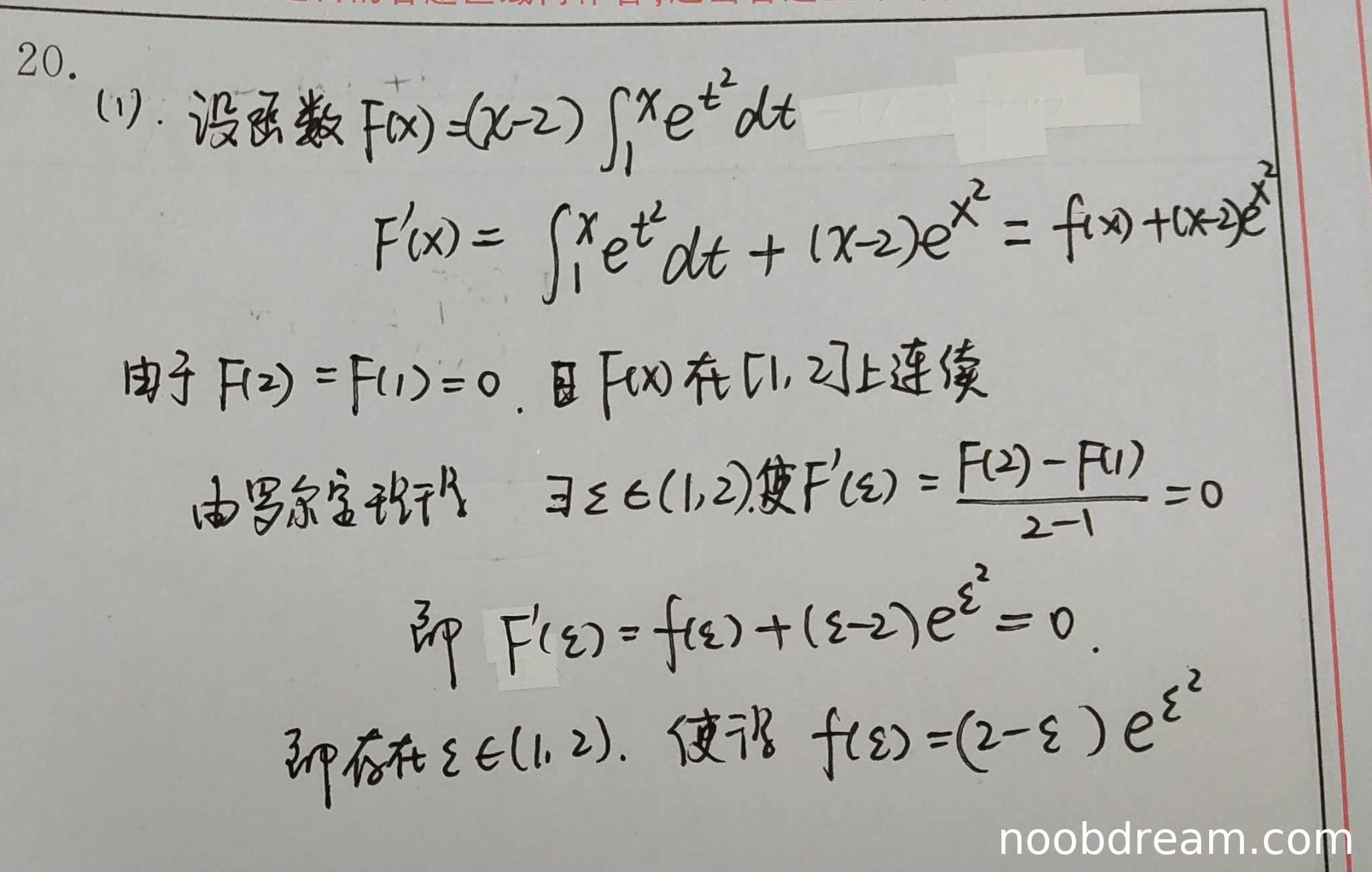 学生作答与标准答案法2完全一致:正确构造辅助函数F(x)=(x-2)f(x),验证F(1)=F(2)=0,应用罗尔定理得到F'(ξ)=0,进而推导出所需结论。逻辑完整正确,得5分。