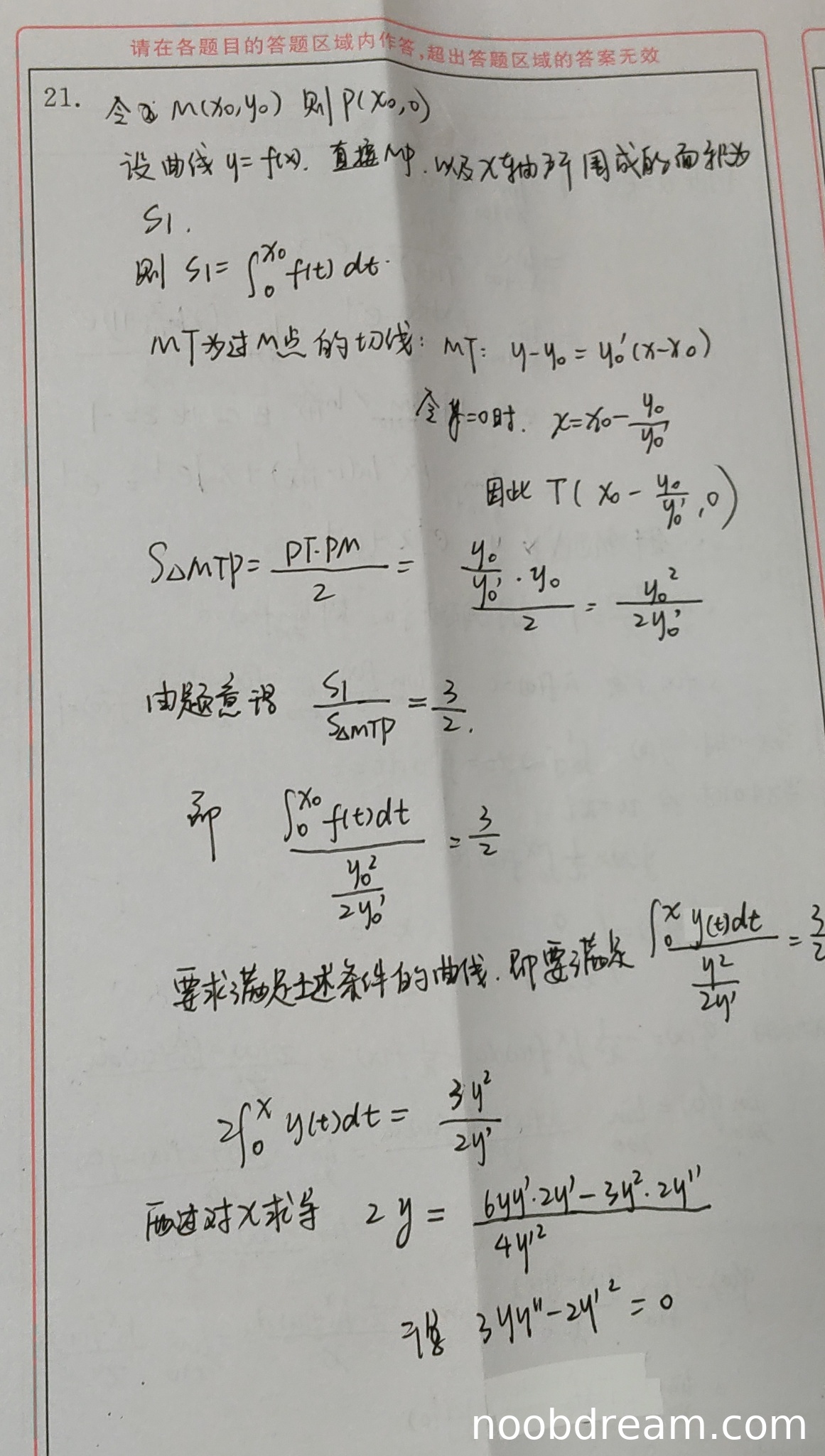 学生正确设定了点M、P、T的坐标,并正确计算了由曲线、直线MP和x轴围成的面积S₁以及三角形MTP的面积S₂。推导出面积比的条件并建立了积分方程。但在对积分方程求导时出现了计算错误:学生写的是“2∫₀ˣ y(t) dt = 3y²/(2y')”,然后求导得到“2y = [6yy'·2y' - 3y²·2y'']/(4y'²)”,这个求导过程是错误的。正确的应该是从“∫₀ˣ y(t) dt = (3/4)(y²/y')”出发求导。不过学生最终得到了正确的微分方程“3yy'' - 2y'² = 0”,这可能是经过修正的。考虑到核心逻辑正确但中间计算有误,扣2分。