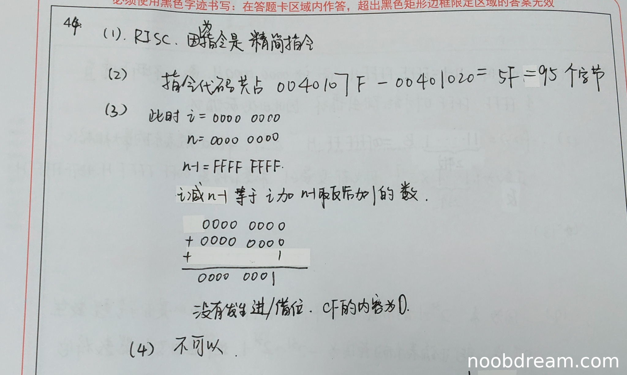 学生正确给出了i=0、n=0时n-1=FFFFFFFF,并进行了补码减法计算(00000000 + 00000000 + 1 = 00000001),但错误得出“没有发生进/借位,CF=0”。标准答案指出减法运算中CF = C⊕1(C为进位输出,此处C=0),因此CF=1。学生计算过程正确但结论错误,扣2分,得1分。
