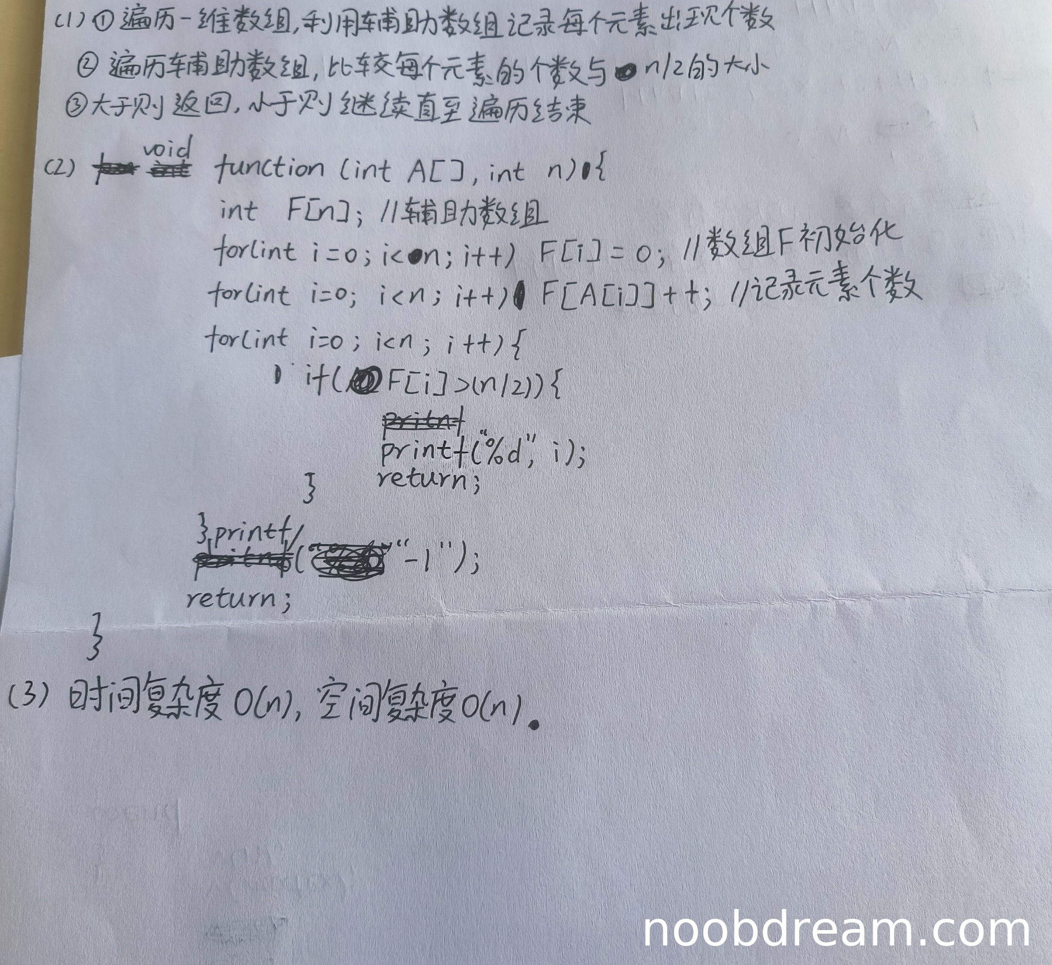 理由:学生的算法思路是使用辅助数组统计每个元素的出现次数,然后遍历辅助数组找到出现次数超过n/2的元素。这种方法虽然正确,但空间复杂度为O(n),不符合题目要求的"尽可能高效的算法"(标准答案的空间复杂度为O(1))。基本设计思想描述清晰,但效率不够优化,因此扣2分。