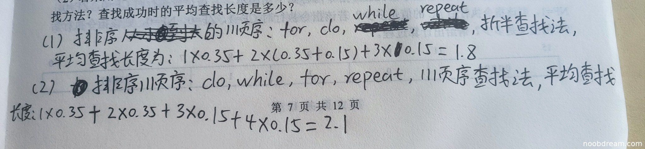 学生答案中采用链式存储结构,按特定顺序排列(clo, while, for, repeat),使用顺序查找法,平均查找长度计算为2.1。标准答案中,链式存储结构可采用顺序查找(按概率降序排列,平均查找长度2.1)或二叉排序树(平均查找长度2.0)。学生答案的排列顺序虽未明确说明按概率降序,但计算出的平均查找长度2.1与标准答案顺序查找方法一致,且计算正确。因此,思路正确,不扣分。得5分。