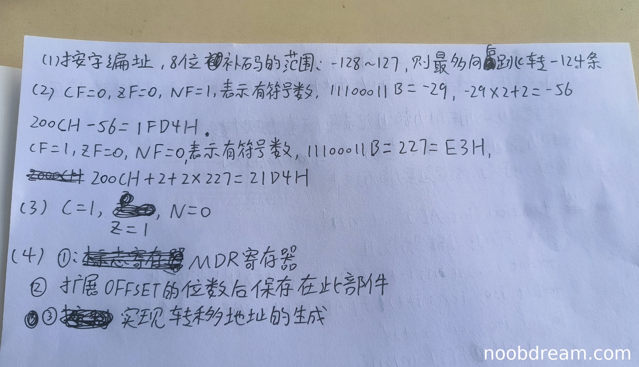 学生回答“按字编址”错误,标准答案为按字节编址,扣1分。对于跳转条数,学生回答“最多向后跳转124条”错误,标准答案为127条,扣2分。但第一次识别结果中出现“-124条”,可能是识别错误,但第二次识别结果明确为“124条”,因此按逻辑错误扣分。本题得0分。