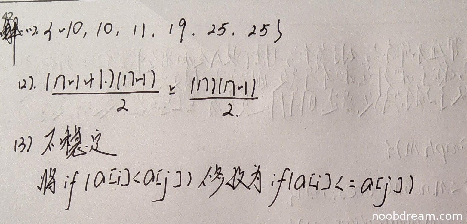 学生正确指出算法不稳定,并给出了正确的修改方法:将`if(a[i] < a[j])`修改为`if(a[i] <= a[j])`,与标准答案一致。因此得4分。