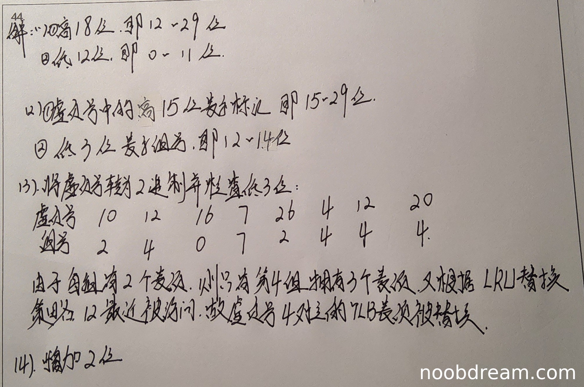 学生正确指出TLB标记为虚页号的高15位(15-29位),TLB组号为虚页号的低3位(12-14位),与标准答案一致。得2分。