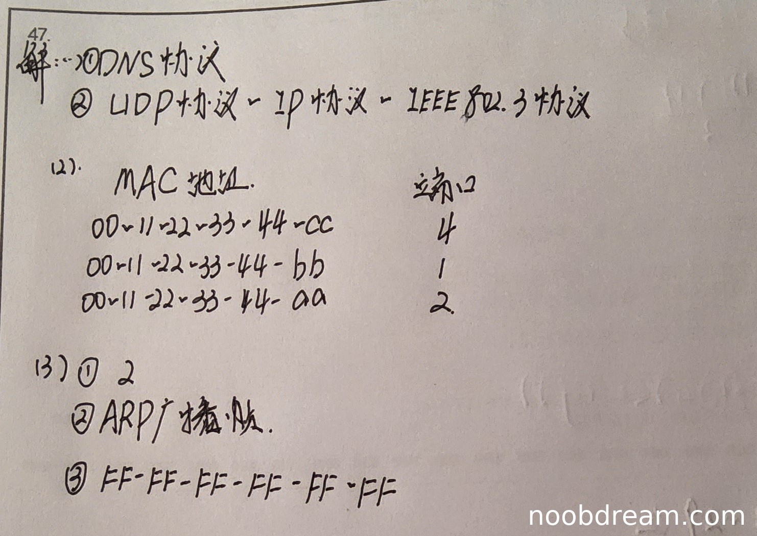 学生正确回答了DNS协议,得1分;在逐层封装部分,学生回答"UDP协议 - IP协议 - IEEE 802.3协议",这与标准答案"DNS报文→UDP数据报→IP数据报→CSMA/CD帧"基本一致。虽然IEEE 802.3协议与CSMA/CD帧表述不同,但IEEE 802.3标准确实包含CSMA/CD,且封装层次正确,因此不扣分。得2分。本小题共得3分。