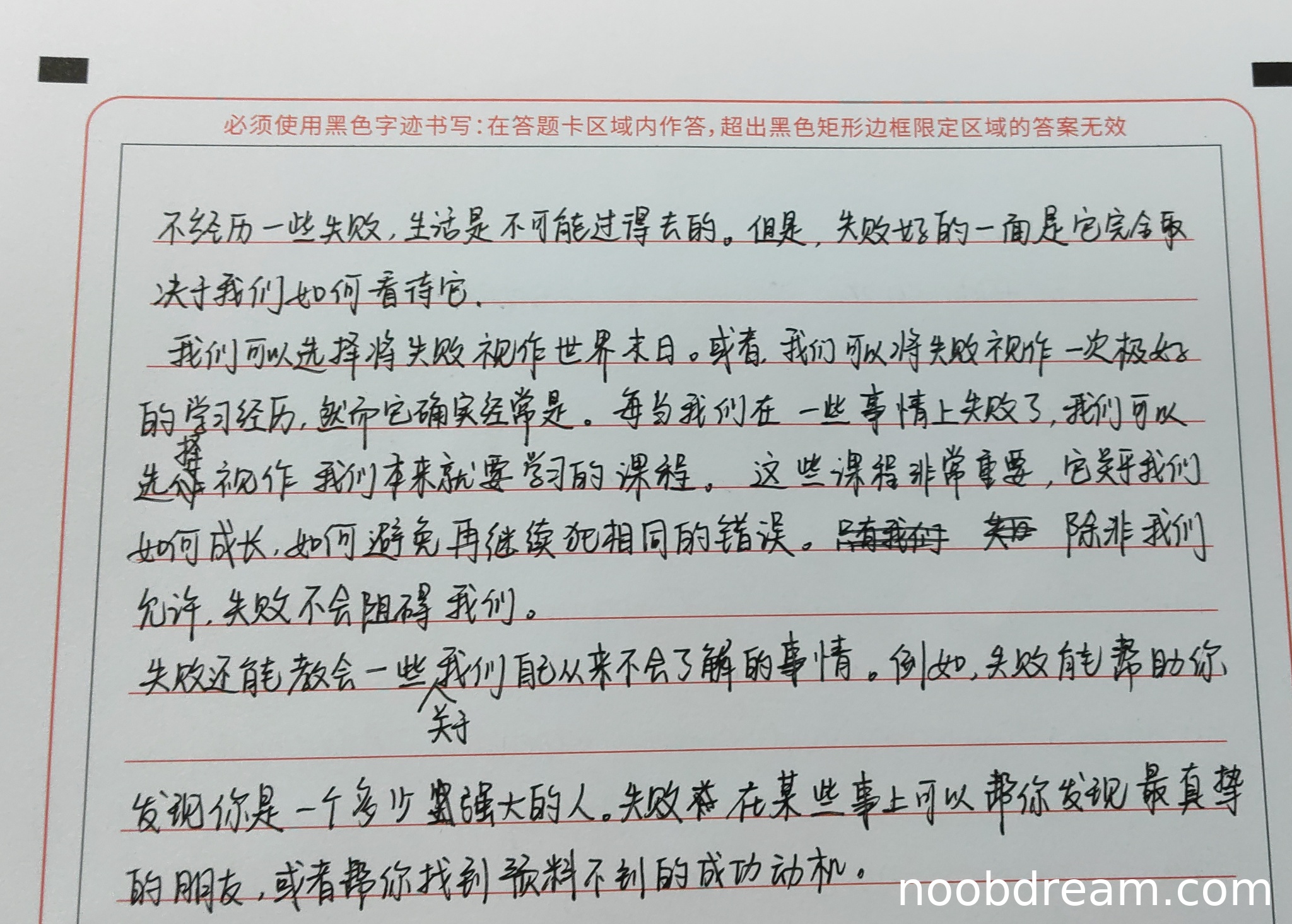 学生作答内容与题目要求不符,题目要求为41-45题选择最合适的小标题,但学生作答内容是关于失败与成长的论述,与题目无关。根据标准答案,本题应选D,但学生未提供任何相关选项,因此得0分。
