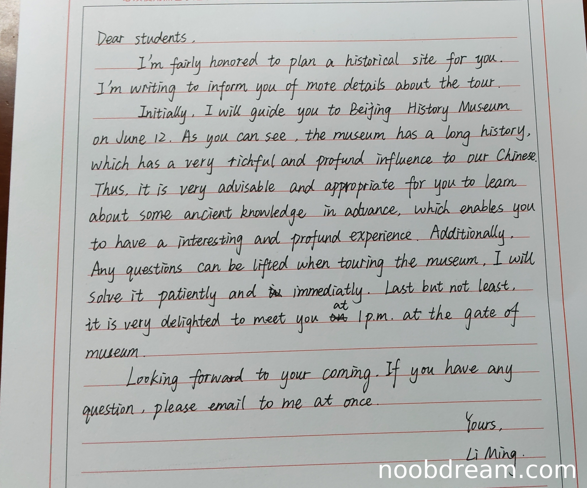 理由:内容基本覆盖题目要求的两个要点:介绍了历史地点(北京历史博物馆)和提供了游览建议(提前学习古代知识、可以提问、集合时间地点)。但存在以下问题:1)对历史地点的介绍过于笼统,只说"有悠久历史"和"深远影响",缺乏具体细节;2)游览建议中"lift questions"表达不地道,应为"ask questions";3)部分建议表述不够明确。整体内容完整但不够充实。