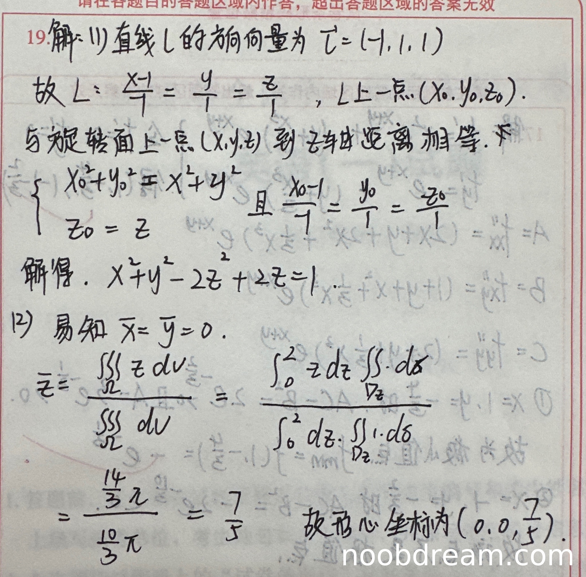学生正确指出形心的x、y坐标为0,正确给出了三重积分计算形心z坐标的公式,并采用先z后面积分的计算方法。虽然计算过程中直接给出了积分结果 \(\frac{14}{3}\pi\) 和 \(\frac{10}{3}\pi\) 而没有展示详细计算过程,但最终结果 \(\frac{7}{5}\) 正确。根据"思路正确不扣分"原则,给满分5分。