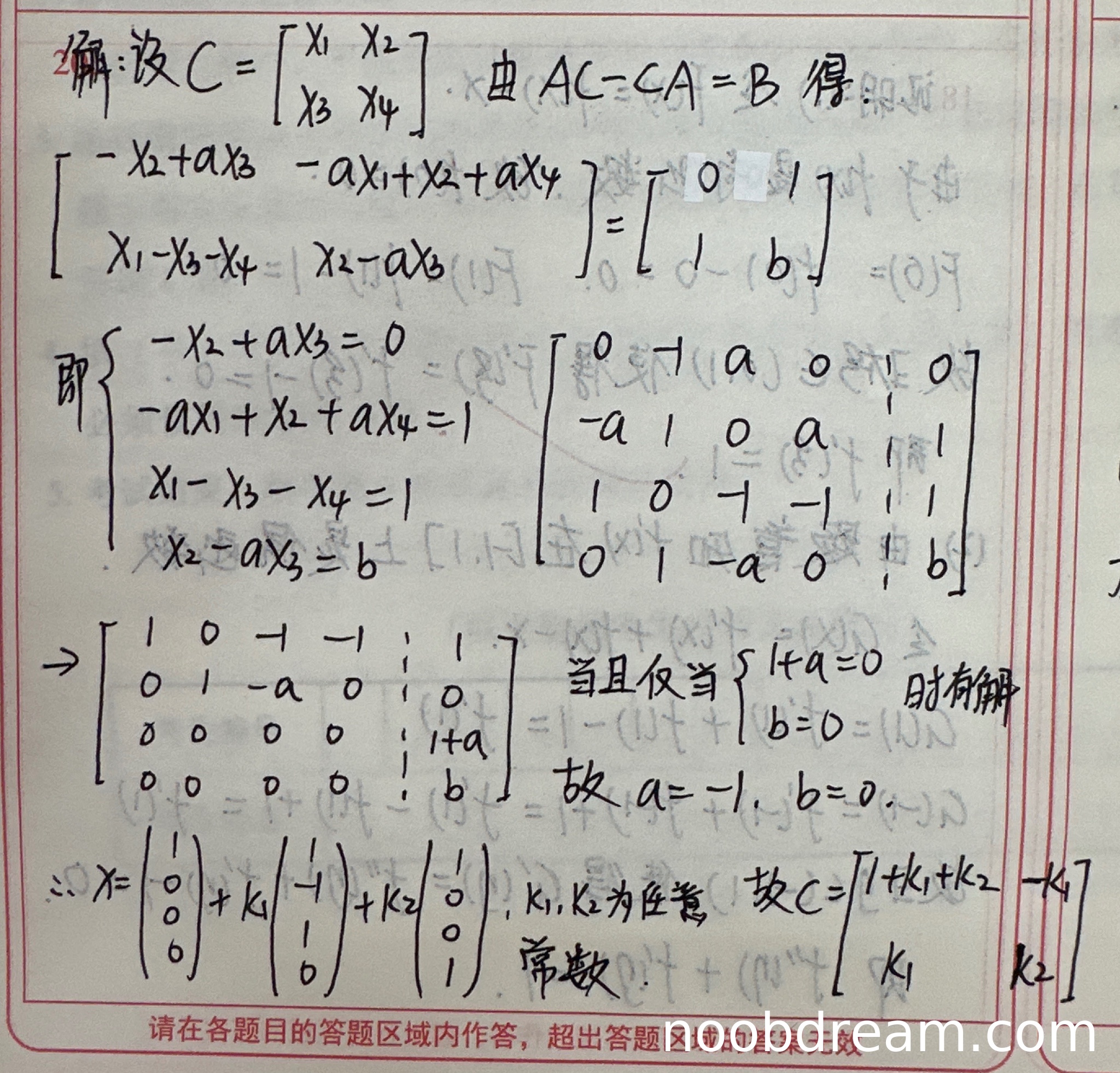 学生正确设出矩阵C的形式,并代入方程AC-CA=B得到线性方程组,这一步与标准答案一致。在求解方程组时,学生正确进行了矩阵的初等行变换,并得出方程组有解的条件为a=-1, b=0,这部分完全正确。