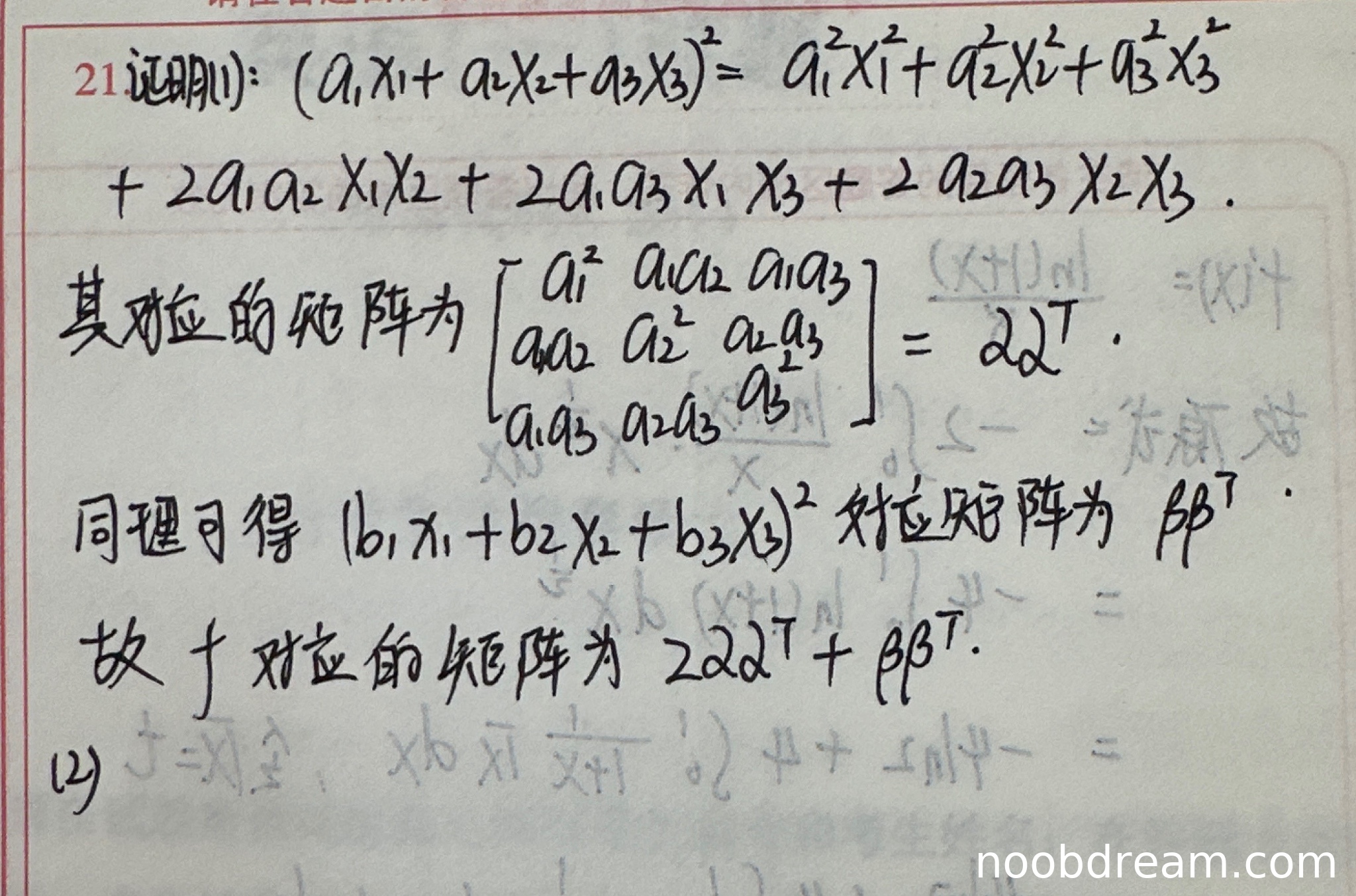 学生正确证明了二次型f对应的矩阵为\(2\alpha\alpha^T+\beta\beta^T\)。具体过程: